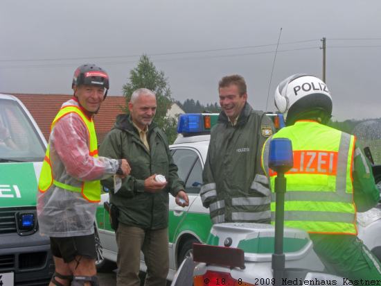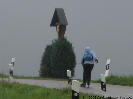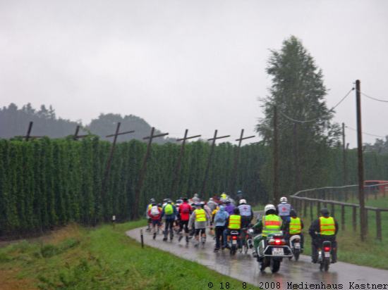 Gestärkt durch einen Energiedrink des Krankenhauses Mainburg und leicht aufgewärmt durch die Gymnastik des Mainburger Injoy-Teams startete diesmal ein zahlenmäßig übersichtlicher Skatertross von Mainburg aus über die Hügel der Hallertau. Sintflutartige Regengüsse blieben zwar während der gesamten Tour aus, doch gerade auf den ersten Kilometern wurden die tapferen Skater ordentlich abgewaschen. Einen glorreichen Einfall hatte Teilnehmer Tom Hierl aus Mainburg, der für fast alle Mitstreiter kostenlose Regenjacken organisiert hatte. "Alles gut bedacht" hieß es sodann beim ersten Sammelstop, für den der Musterbau eines örtlichen Dachziegelwerkes Trockenheit spendete. Die beiden "Bergprüfungen" bei Steinbach und Berg wurden alsdann ebenso unfallfrei bewältigt wie später die Hügel zwischen Wolnzach, Niederlauterbach und Rottenegg. Das Sanitäterduo Robert und Christoph Denk blieb während der gesamten Tour von Arbeit verschont - "ein Verdienst der Teilnehmerdisziplin", so Wolfgang Inderwies. Solide Arbeit leistete das "Honda-DAX-Team", vier Mopedfahrer, die mit ihren wendigen Gefährten dem einen oder anderen Skater Zughilfe gewährten. Und bei stärkerer Erschöpfung standen schließlich auch noch zwei Begleitbusse als "Beserlwagen" zur Verfügung.