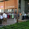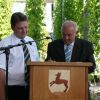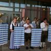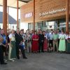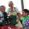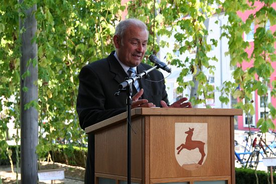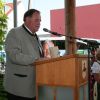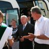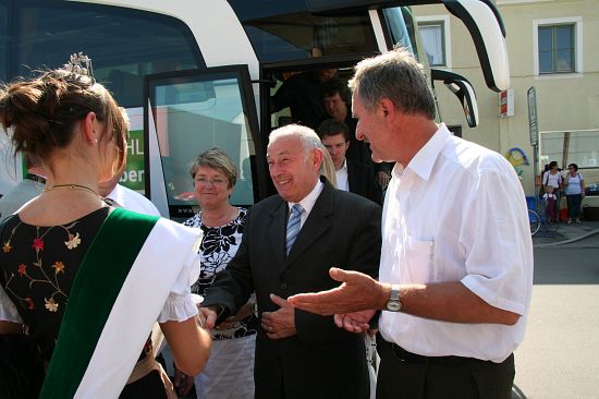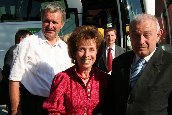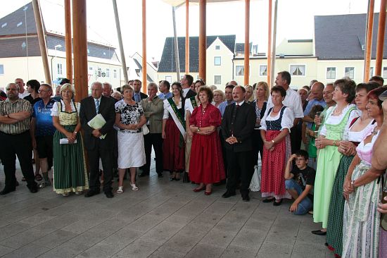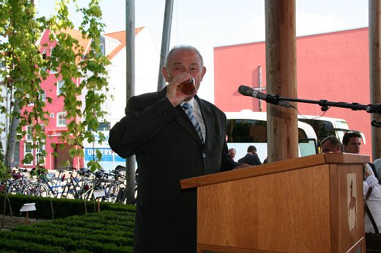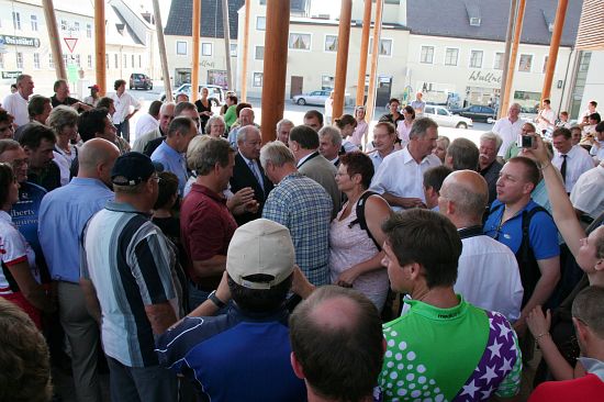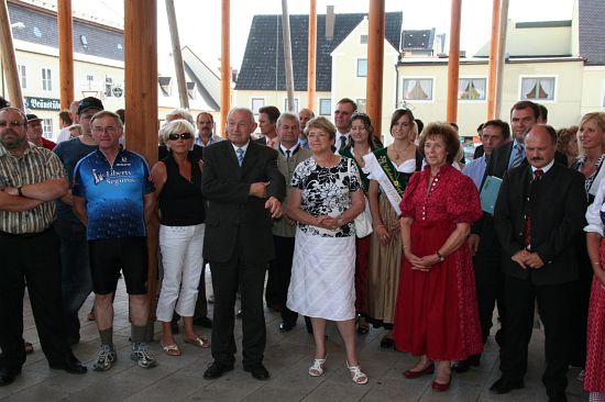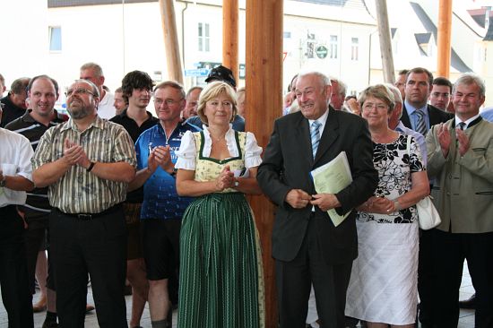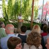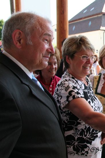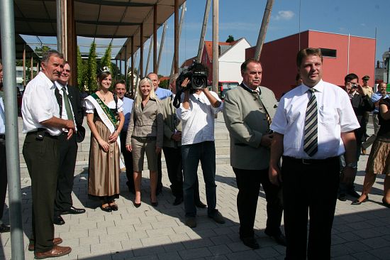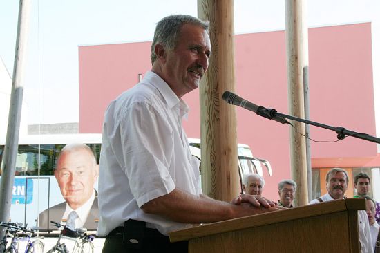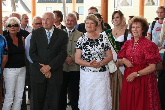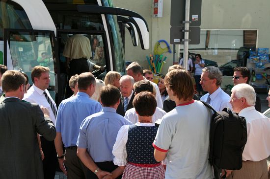 Wolnzach, 19.08.08 (ted). Königswetter. Der Landesvater auf Wahlkampftour. Am Dienstag war der Landkreis Pfaffenhofen dran. Erika Görlitz suchte die Begegnungspunkte aus. Nach Hohenwart (Regens Wagner- Behindertenbetreuung), Scheyern (Agrarforschung, Kloster und Mittagessen), Rohrbach (Softwarehaus ContentServ) hatte der Markt Wolnzach die ehrenvolle Rolle des Schlusspunkts. Vor dem Hopfenmuseum nach all den Vorrednern blühte Dr. Günther Beckstein richtig auf, ging auf all die Wünsche und Anliegen ein, trank genüsslich Bier und erinnerte sich, wie er als Bub Hopfen pflückte.