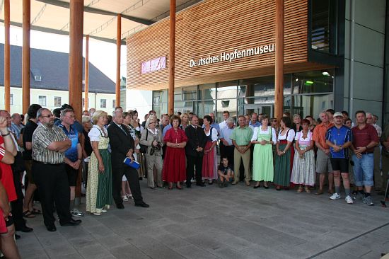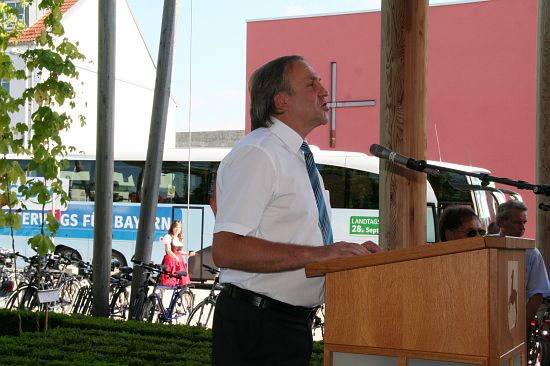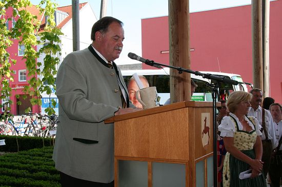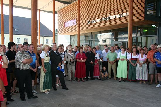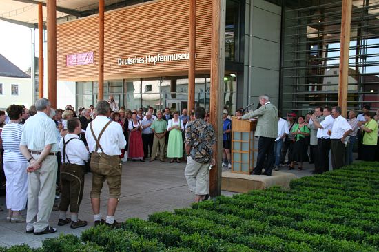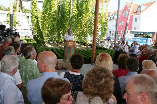 In Bayern müsse auch das Bier seinen Traditionswert behalten. Mit dem Oktoberfest sei dies unabdingbar. Zudem fördere das Bier die Stimme, gerade nach Reden im Bierzelt. Dr. Beckstein: „Das Bier gehört zu Bayern wie Scheyern“. Alkoholprobleme kämen doch nicht aus dem Bier. Vielmehr seien es Billigfusel v. a. in Mischgetränken. So sympathisch humorvoll nahm der Ministerpräsident all die Zuschauer in seinen Bann. Dazu das herrliche Spätsommerwetter. Ein Wahlkampf, der gut ankam. Ja, er ist der Landesvater geworden, locker und doch bestimmend. Er wird nach dem 28. September weiterregieren und als Ministerpräsident das Hopfenmuseum besuchen.