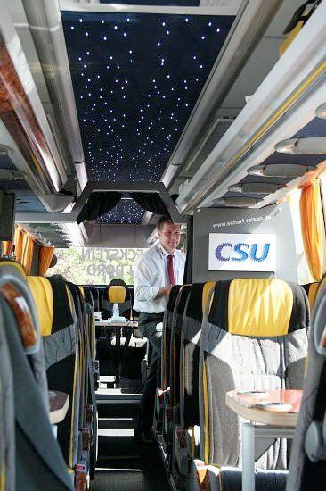 Rohrbach, 19.8.08 (ted). Der Bus mit dem Maxi-Fotoaufdruck Counterfights des Ministerpräsidenten ist sein Wahlkampf-Mobil. Er bietet ein Maximum an Komfort – von der gefüllten Bar bis zu modernster Kommunikationstechnik. In Rohrbach durfte der Wolnzacher Anzeiger einige Bilder vom Inneren des Busses schießen.