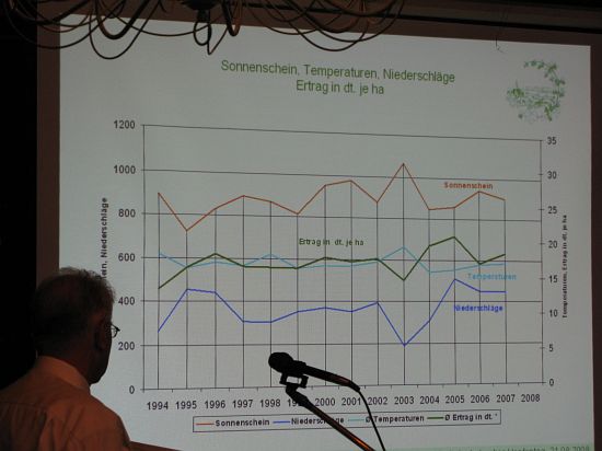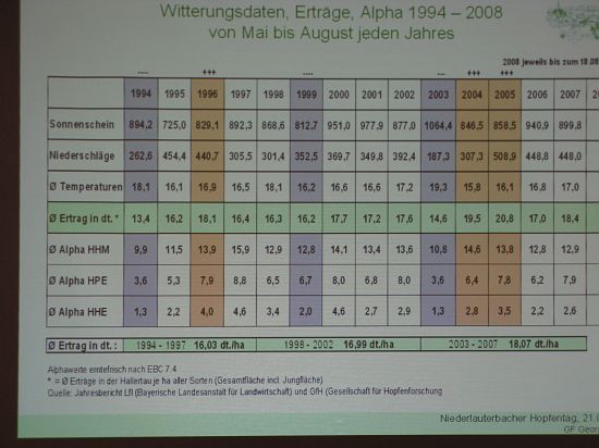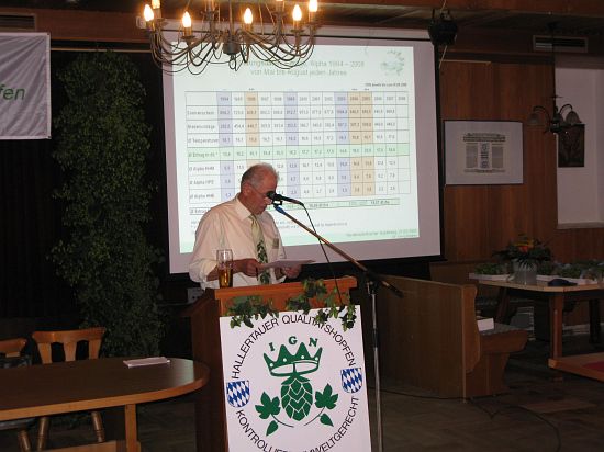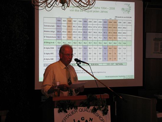 Der Exkursion schloss sich wie alle Jahre bei Kaffee und Kuchen im Reich-Saal Niederlauterbach der theoretische Teil des Hopfentags an. Vorsitzender Georg Breitner referierte über die Zusammenhänge von Ertrag und Alphagehalt mit Niederschlagsmengen, Durchschnittstemperaturen und Sonnenscheinintensität. Sie bestätigten statistisch was die Praktiker über das ideale Hopfenwetter schon längst wissen. Die hoch aggregierten Zahlen ließen aber keine Prognose zu. Wichtig ist z.B. die gleichmäßige Verteilung der Niederschläge und nicht so sehr die Gesamtmenge wie ebenso z.B. die Temperaturen im Juli und August besonders wichtig für die Alphabildung sind.