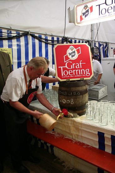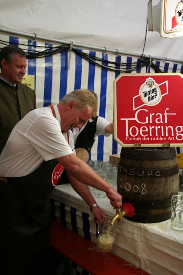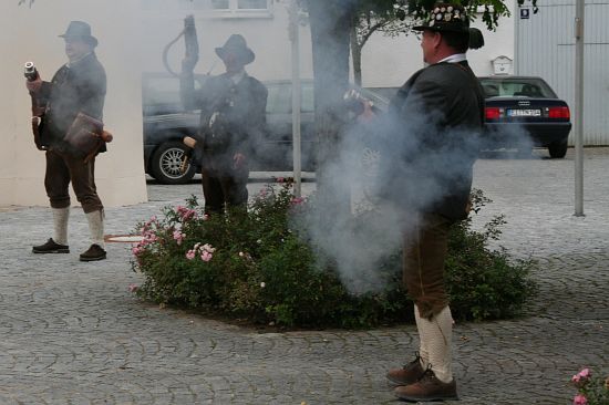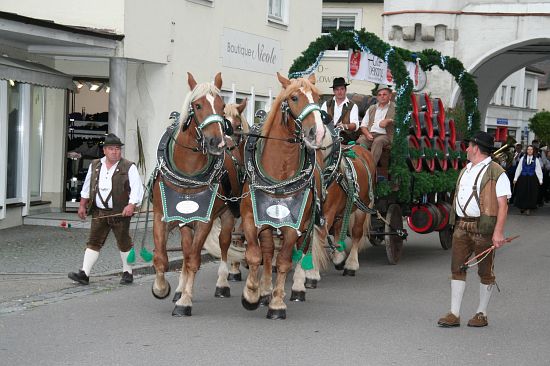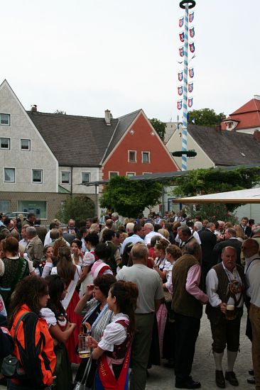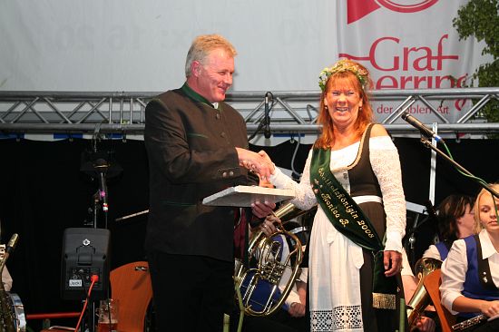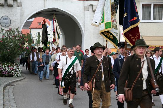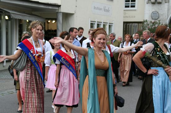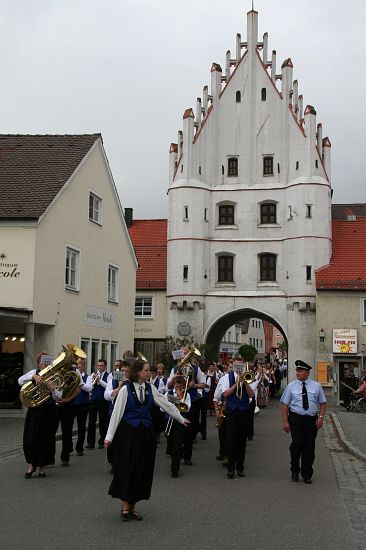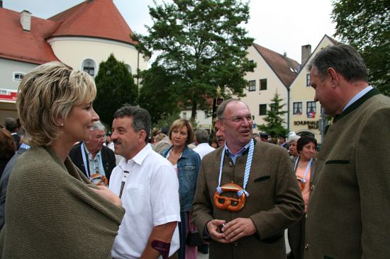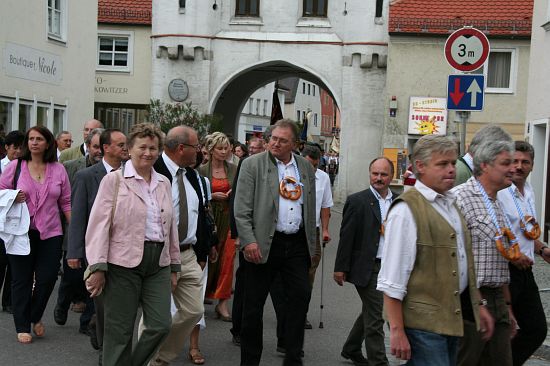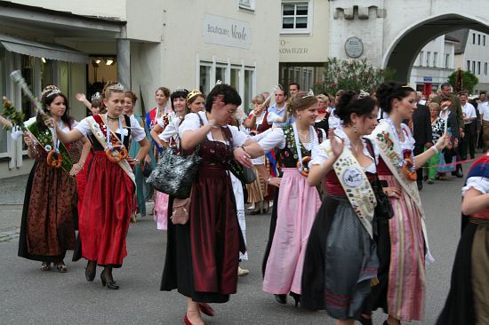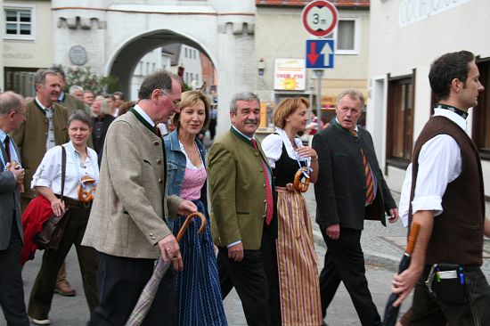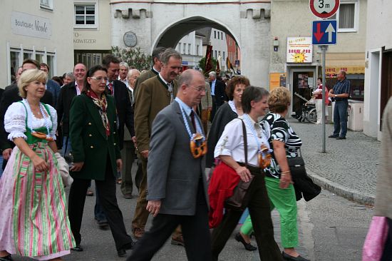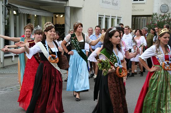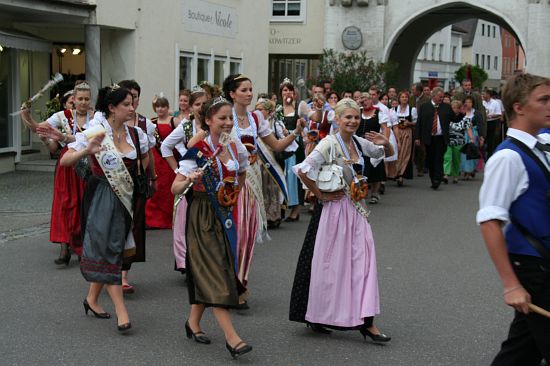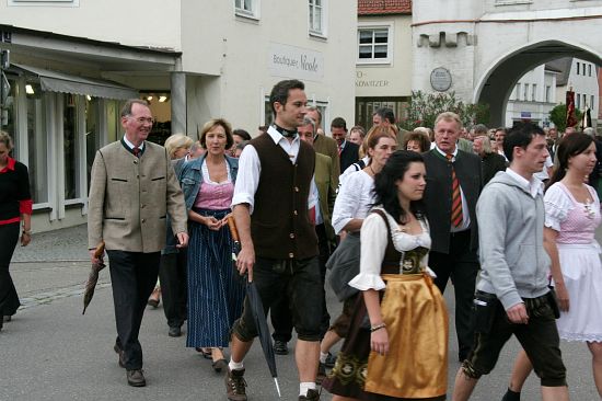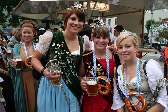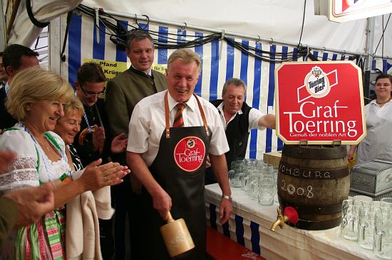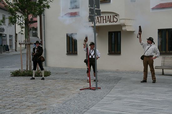 Mit dem Standkonzert der Stadtkapelle Vohburg vor dem Rathaus begann das 45. Vohburger Volksfest. Die Böllerschützen hatten das Standkonzert und den Ausmarsch mit Salutschüssen umrahmt. In Begleitung vieler „Gekrönter Häupter“ und den Ehrengästen marschierten sie zum Festplatz. Bürgermeister Martin Schmid schlug das erste Fass gekonnt mit 3 Schlägen an.