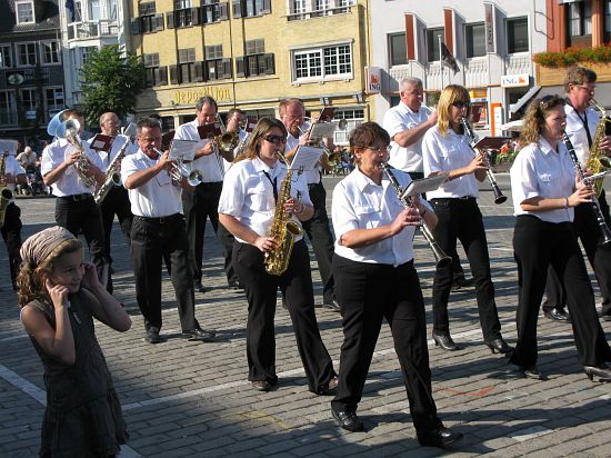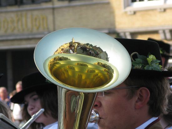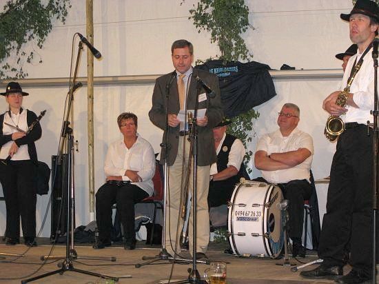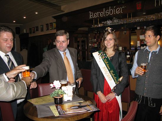 Zum Hopfenfest wurde dieses Jahr an einem anderen großen Platz (Poperinge hat davon mehr!) ein Zelt aufgebaut, das fast schon die Wolnzacher Mehrzweckhalle einholt. Zur Wahl der Hopfenkönigin war es übervoll – ca. 2500 Leute kämpften mit den 12 Bewerberinnen, die in vier Gruppen gegeneinander wetteiferten, moderiert von der reizenden Ex-Miss-Belgien. Es ging so hoch her, dass der Eingangssteg nach Mitternacht zusammenkrachte und alle 2500 Gäste herausgehoben werden mussten. Aber die Belgier nehmen so etwas ganz „cool“. Die Lebenslust, die Begeisterung wird dadurch nicht getrübt. So war für die Wolnzacher die Begegnung 1.000 km von der Hallertau entfernt, herzerfrischend, motivierend, horizonterweiternd. Gut, dass wir Poperinge haben. Aber auch die Marktkapelle, die dort als Stadtkapelle viele Dienste erfüllt: Den Marsch zur Eröffnung des Bierfests anführt, von der Stadtkirche zur Kranzniederlegung am Kriegerdenkmal vorausmarschiert, die Nationalhymnen für alle Delegationen spielt (prima einstudiert!) und beim großen Zapfenstreich der Poperinger Kapellen (sie haben vier!) ganz selbstverständlich die No. 5 darstellt. Auch die Wolnzacher Schützen kamen und marschierten im Festzug mit, als Beschützer der Hallertauer Hopfenkönigin, die einen herrlichen Wagen vorbereitet bekam. Und als die Wolnzacher nach Hause fuhren, fühlten sie sich in Flandern zuhause, hatten sie sich an die flache Landschaft gewöhnt, eine zweite Heimat gefunden…