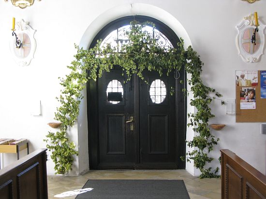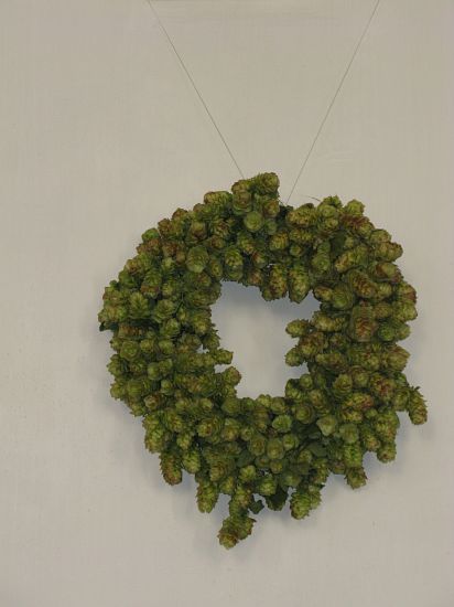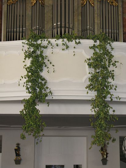 Viele Spezialitäten finden sich in dem Früchte – Arragement, darunter auch ganz Ausgefallenes aus heimischen Gärten. Auch mit Hopfen zur Dekoration wurde nicht gespart. Die Pfarrkirche hält wenigstens mit der Hopfenstadt Poperinge mit. Ja noch mehr: dort waren die Kirchen nicht so schön mit Hopfen geschmückt.