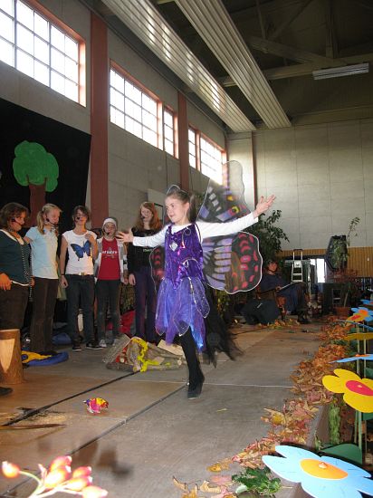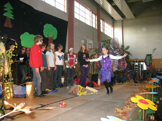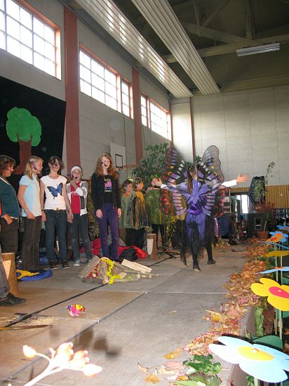 Vor dem Hintergrund einer „lichterloh“ brennenden Welt brachten der Kinderchor Scheyern mit Alice Köstler-Hösl, die Aktionsgruppe Sonnenblume mit Vroni Feldmann und die Musical-Band mit Hans Hösl unter dem Titel „Wie ein Schmetterling“ ein dramatisches Stück auf die Bühne, an dem die Beteiligten über ein Jahr gearbeitet haben. Aus Übermut verursachen ein paar Jugendliche beinahe eine Katastrophe, doch in der sowohl für Kinder als auch für Erwachsene liebevoll inszenierten Allegorie auf den Untergang der Welt geht alles gerade noch einmal gut …