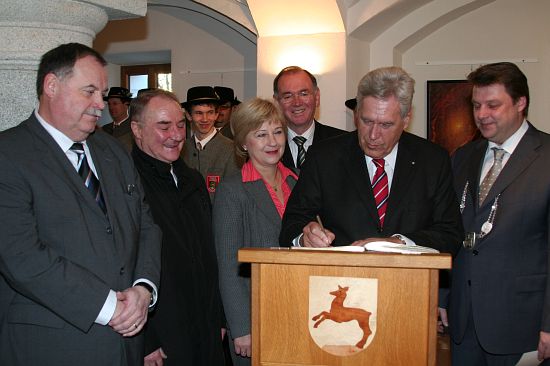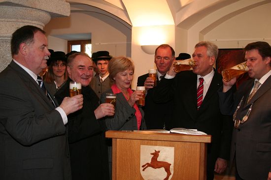 Bei einer Veranstaltung, die am Samstag und Sonntag im Hotel Hallertau stattfindet, handelt es sich um das "Schwaben- und Altbayerntreffen" der Bezirksverbände der Jungen Union Oberbayern, Oberpfalz, Niederbayern, Schwaben und München. Bevor die Tagung am Samstag, 24. Januar, ihren Auftakt nahm, wurde Bundeswirtschaftsminister Michael Glos um 9:30 Uhr vom Wolnzacher Bürgermeister Jens Machold, der Marktkappelle, den Gemeinderäten sowie Landrat Josef Schäch ,MdL Erika Görlitz , MdB Franz Obermeier und zahlreichen Ehrengästen begrüßt und hat sich im Wolnzacher Rathauskeller in das Goldene Buch des Marktes eingetragen.
