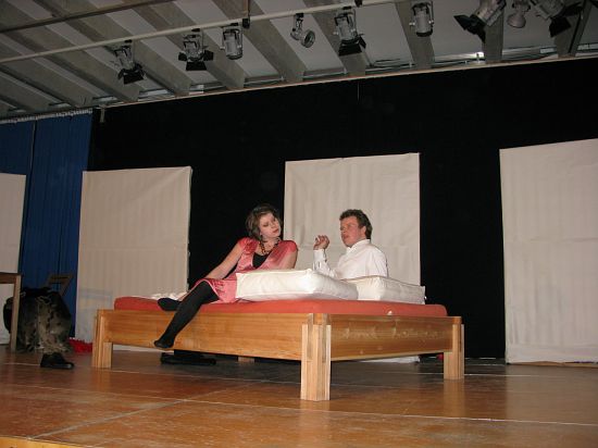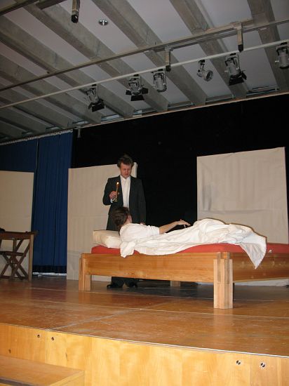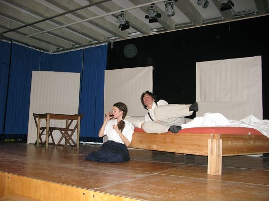 Die „Zehn Dialoge mit neun Unterbrechungen und einer Moral am Schluss“ fesselten die zahlreichen Zuschauer in der Aula von der ersten Sekunde an, als die Begegnung des Soldaten und der Dirne ohne Umschweife das Thema des Stücks offenlegte: Mit einem verächtlichen Blick auf die unterschiedlichsten Beziehungen zwischen Mann und Frau zeigte der „Reigen“, dass es immer nur um das „Eine“ geht, und wenn das erreicht war, hatte es einer der beiden Partner äußerst eilig, sich aus der Situation davonzustehlen. Die sexuelle Begierde als Motor kurzzeitiger Beziehungen ließ den Personen keinen Raum für gegenseitiges Verständnis oder gar eine tiefer gehende menschliche Beziehung. Und immer zeigten sich die Beziehungen auch als ein Spiel mit der Macht, die man über einen anderen Menschen ausüben kann.
