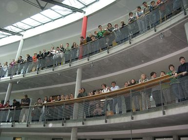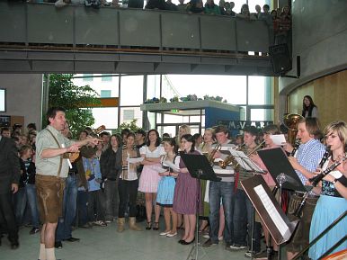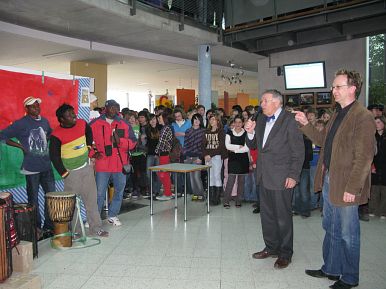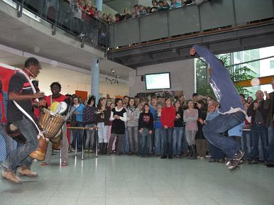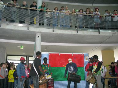 Schon bei den ersten Takten waren die Zuhörer vom originären Sound der Afrikaner ergriffen und verfolgten mit staunenden Augen die rasenden Hände an den Trommelfellen(sic!). Doch auch die Schüler hielten für die Trommelgruppe eine Überraschung parat: Unter Leitung von Michael Sandt hatten sie einen Zwiefachen einstudiert, den sie als „original bavarian music“ stilgerecht in Dirndl und Lederhose, mit Chris Kuttler an der Gitarre, zum Vortrag brachten.