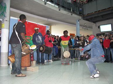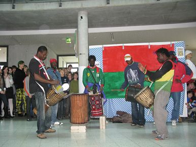 Die afrikanische Gruppe „Diamanadia“, die mit ihrer Musik und den traditionellen afrikanischen Tänzen das Erbe ihrer Vorfahren vor dem Vergessen bewahren wollen, ist nämlich im Rahmen der Initiative „Main dans la Main“ (Hand in Hand) in ganz Europa unterwegs, um speziell bei der jungen Generation in Europa Verständnis und Interesse für die Situation in Westafrika zu wecken. Und das ist im Hallertau-Gymnasium auch in den anschließenden Workshops mit den Künstlern eindrucksvoll gelungen.