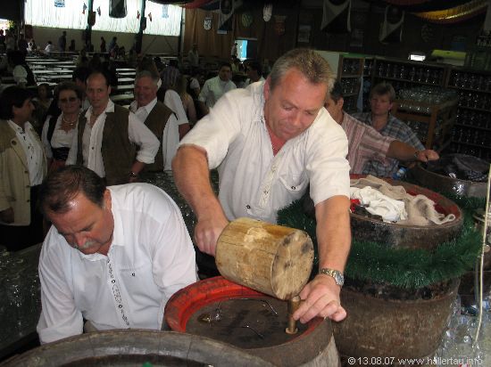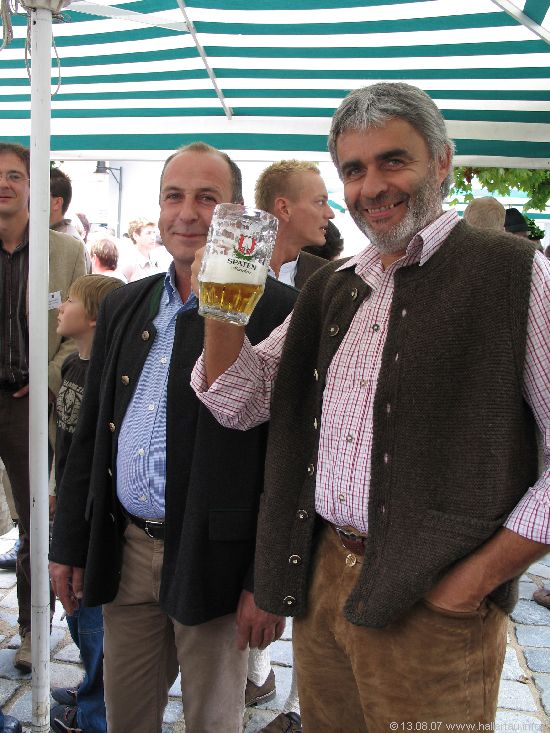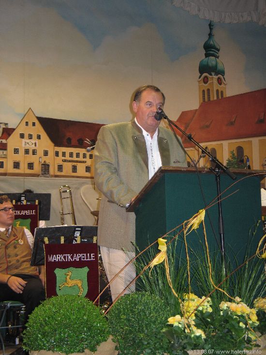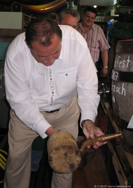Bürgermeister Schäch brauchte drei Schläge zum "Ozapft is". Seine letzte Grußrede zur Volksfesteröffnung, seine 18., war eher verhalten und beschränkte sich auf kurze Kommentare zu den Begrüßten. So schalte er gerne sein Handy ein, wenn MdB Franz Obermeier die Kunde von Zuschüssen aus Berlin überbringen möchte. Oder die drei Hopfenköniginnen ihre Aufgaben so gut erfüllt hätten, dass sie sogar öfter als Landrat Rudi Engelhard in der Zeitung abgebildet seien. Rudi Engelhard empfahl Schäch die Kandidatur zum CSU-Parteivorsitzenden - besser als die Pauly, die er immer noch als Stellvertreterin heranziehen sollte, wenn es ihm langweilig würde. Über Kollegen Dieter Huber (Rohrbach) wollte er gar nichts sagen, damit er nicht mehr nein sagen könne.