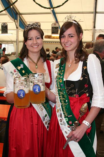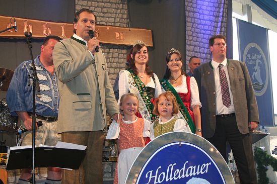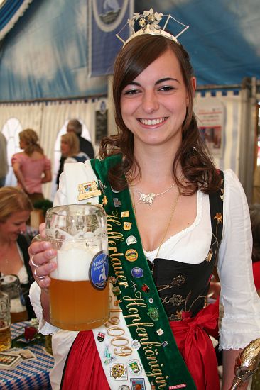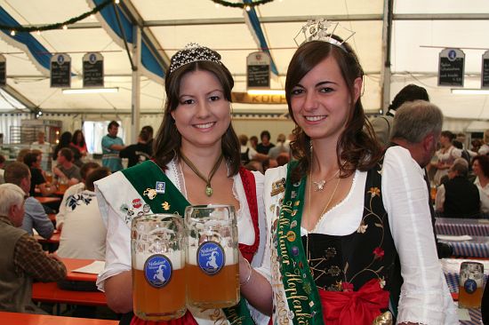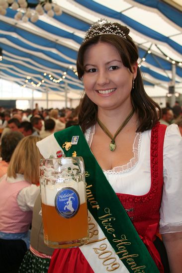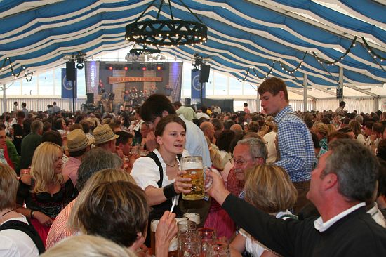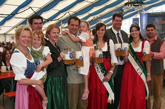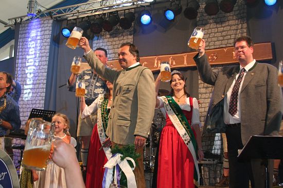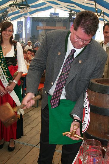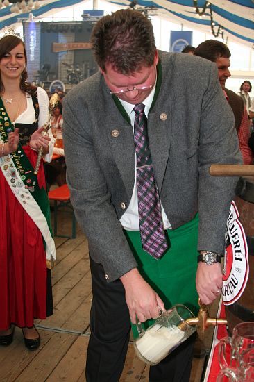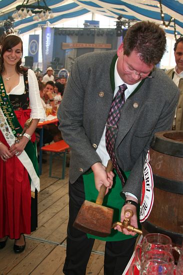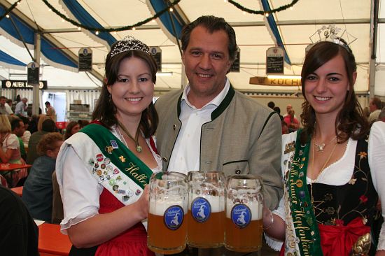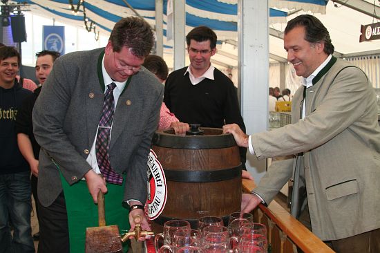 Beim Pfingstfest der Schloßbrauerei Au gelang Landrat Michael Schweiger im Festzelt der Anstich mit nur 2 Schlägen. Baron Freiherr von Peccoz eröffnete das Pfingstfest mit einer kurzen Ansprache und auch die Hopfenkönigin Nicole Frankl aus Mittersberg und Vizekönigin Maria Hainzinger aus Giegenhausen stimmten die Gäste auf die drei Festtage in der Auer Weißbierhalle ein. Das spritzige Weißbier fand unter den bayerischen Klängen der „Blechblos´n“ besten Absatz, die Stimmung im Festzelt brodelte, und bei Braten und Hendl blieb auch niemand hungrig. Ein Höhepunkt des Pfingstwochenendes.