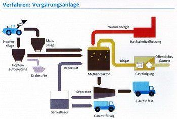 Franz Högl, dessen Firma bereits Erfahrungen gesammelt hat mit Energiegewinnung aus Hopfenhäcksel, stellte die geplante Anlage dem Gemeinderat vor: Während der Hopfenernte werden die Hopfenhäcksel mittels Container täglich bei den Pflanzern abgeholt und von der HVG bei Anlieferung in der Anlage einer Probennahme zur Qualitätssicherung unterworfen. In der Bio-Erdgasanlage wird die Silage aus gehäckselten Hopfenreben, Mais, Ganzpflanzen und Gras unter Luftabschluss vergoren. Dabei entsteht Biogas, das zu Bio-Erdgas veredelt wird, indem es von Kohlendioxid befreit und anschließend verdichtet wird. In Erdgasqualität kann es dann ins lokale Erdgasnetz eingespeist werden. Faszinierend an der Anlage findet Franz Högl, dass Energie aus Ressourcen gewonnen wird, die bereits vorhandenen sind und nicht speziell dafür angebaut werden.