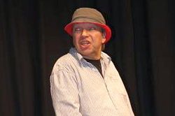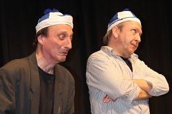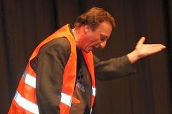 Michael Eberle als Stau-Opfer Das Stachelbär-Duo Volker Bergmeister und Michael Eberle ist seit Jahren Garant für herrlich komische, bitterböse Satire mit heftigen politischen Seitenhieben. Die beiden sorgten zum Saison-Abschluss des Theater Donnerstags nochmals für beste Stimmung im ausverkauften LSK-Theater. Das Publikum wird über die Sommerpause die vielfältigen Kabarett-Programme vermissen und freut sich schon jetzt auf den nächsten Zyklus, der zu den kulturellen Höhepunkten der Stadt im Winter gehört und zahlreiche treue Fans hat. Bergmeister und Eberle brauchen nicht viel auf der Bühne, zwei Stühle sind ihre Ausstattung, die beiden füllen mit ihrer Persönlichkeit, oder eher den vielen Personen, die sie verkörpern, in die sie schlüpfen und die sie blitzschnell wechseln. |