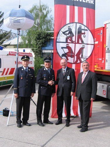 Einen sog. „Powermoon“ hat Helmut Steck von der Versicherungskammer Bayern kürzlich an amtierenden Landrat Anton Westner (2.v.r.), stellv. Landrat Franz Rothmeier (re.) und Kreisbrandrat Karl Eder (li.) übergeben. Bei dem Powermoon handelt es sich um ein Beleuchtungsgerät, mit dem der Standort der Einsatzleitung bei Dunkelheit kenntlich gemacht und das Umfeld bis zu einer Größe von einem Fußballfeld ausgeleuchtet werden kann. Anton Westner bedankte sich sehr herzlich für die Spende. Die Versicherungskammer beabsichtigt, bis Ende 2012 alle bayerischen Landkreise und kreisfreien Städte mit einem Powermoon auszustatten. |