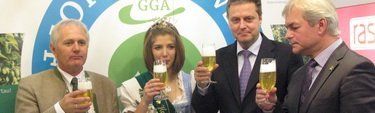 | Der Amtschef des Bayerischen Landwirtschaftsministeriums, Martin Neumeyer, ließ es sich nicht nehmen, im Anschluss an die Pressekonferenz der Hopfenwirtschaft, persönlich die offizielle Ernennung zu übergeben, dass die EU die Bezeichnung „Hallertauer Hopfen“ geographisch geschützt hat. Hopfenpflanzerverband-Geschäftsführer Otmar Weingarten präsentierte dazu das neu entworfene Signet. Auch eine gedruckte Gebrauchsanweisung zum Signet erhalten alle Lizenznehmer. Sie müssen für ihr Bier mehr als 50% des Hopfens aus der Hallertau beziehen. Dafür ist die Lizenz kostenfrei. Weingarten will damit nun in die Offensive gehen. Auf vier Flaschen demonstrierte er, wie das neue Qualitätszeichen in das Design eingebunden werden kann. Auch der Tettnanger Hopfen ist geographisch geschützt, wozu aus dem Baden-Württemberger Landwirtschaftsministerium Frau Dr. Brigitta Hüttche extra nach Nürnberg kam und ihr Zeichen vorstellte. Im Anschluss besuchten die Ehrengäste den Stand des Bayerischen Landwirtschaftsministeriums, der auch dem Hopfenpflanzerverband als Basis dient. Neumeyer stellte die Verdienste des Clusters Ernährung besonders heraus. Die Hopfenköniginnen gaben der Präsentation herrschaftliches Gepräge. |