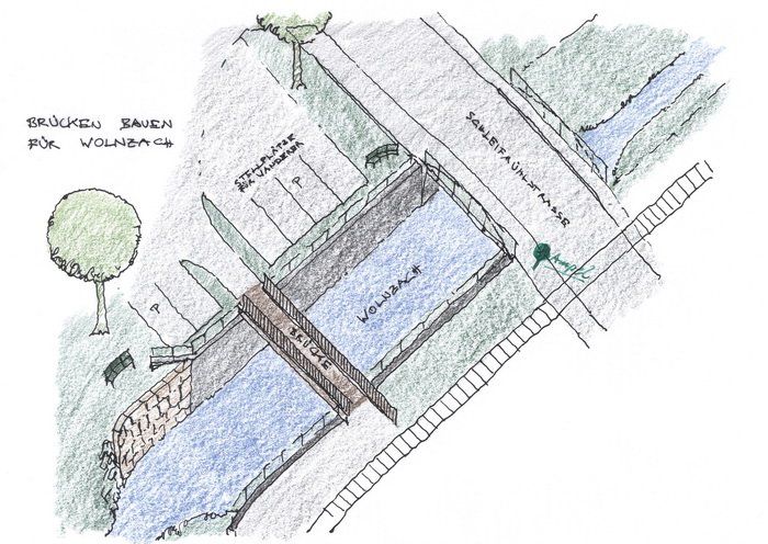 | Höhere Wellen als der dazugehörige Bach schlägt der ungelöste „Knoten“ am Bahnübergang „Schleifmühlbrücke“. Nun hat die Interessengemeinschaft „Brücken bauen“ dem Marktgemeinderat einen kostengünstigen Vorschlag unterbreitet. Das Schreiben in Wortlaut: „Wir wollen keinen Schildbürgerstreich, wir wollen nur „Brücken“ bauen, denn Wolnzach ist auch unsere Heimat Sehr geehrter Herr Bürgermeister, sehr geehrte Damen und Herren des Marktgemeinderates, überrascht von den Äußerungen im Wolnzacher Gemeinderat („Schildbürgerstreich, Katastrophe, unmöglich“ usw.) haben sich einige Wolnzacher Bürgerinnen und Bürger zur Lösung „Wanderweg entlang der Wolnzach – Kreuzung Bahn-Schleifmühlstraße“ Gedanken gemacht. Brücken verbinden – Gräben trennen. Hier ein Vorschlag von einigen Wolnzachern. Wir haben mit einer Zeichnung (siehe Plan unten) dargestellt, wie dieser Übergang aussehen könnte. Diese dargestellte Fußgänger- und Radfahrerbrücke kann problemlos vom Geh- und Radweg von Gosseltshausen aus erschlossen werden, vollkommen isoliert und abgesichert gegen die Bahnstrecke. Auf der Ostseite des Schleifmühlgeländes könnte eine kleine Grünanlage mit Parkplatz entstehen (siehe Plan). Dieser Parkplatz kann dann von den Spaziergängern als Anlaufstelle auch mit ihren Fahrzeugen benutzt werden und würde sicher auch zu Volksfestzeiten gute Dienste leisten. Sie werden sicher fragen, wer das alles bezahlen soll. Wir denken, wenn der Markt Wolnzach die Brücke kostenlos geliefert und montiert bekommt und von der Marktseite aus nur die Wegeanschlüsse erstellt werden müssen, dann kommen keinerlei Kosten auf die Gemeinde zu, die nicht schon immer bekannt gewesen wären. Sollten Sie diesem Vorschlag zustimmen, versprechen wir die kostenlose Realisierung – sicher erst nach den behördlichen Genehmigungen – innerhalb 48 Stunden. Wir, die Interessengemeinschaft „Brücken bauen“, würden auch gerne noch zwei Bänke für den Parkplatz stiften (siehe Plan). Wir würden uns freuen, wenn wir einen guten Vorschlag unterbreiten durften. Mit freundlichen Grüßen Interessengemeinschaft „Brücken bauen“ Joachim Tietze Josef Schäch“ |