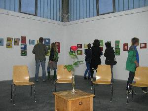 „Demokratie muss gesungen werden!” Jenem Beuysschen Imperativ folgte eine Gesangsgruppe um Helene Charitou und Peter Trapp in einem A-Cappella-Auftritt, wobei einem Sänger der Gruppe eine gewisse Ähnlichkeit mit dem großen Künstler, dessen 25. Todes- und 90. Geburtstag die Ausstellung würdigte, nicht abgesprochen werden kann – zumindest im Gegenlicht der Fenster über den Exponaten in der Kulturhalle.