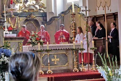Wolnzach, 14.8.11 (ted) Das feierliche Hochamt am Patrozinium, dem Fest des Heiligen Laurentius, war gerade gut genug zur Begehung des 50-jährigen Jubiläums des Wolnzacher Steyler-Missionars, der am Ostermontag 1961 in Wolnzach seine erste Messe las. In der Heimat, in der "so großartigen Kirche mit dem so vorbildlichen Patron" wollte Sebastian Sperl zurückblicken mit einer Messe. Seine Predigt ging unter die Haut: er wollte den Geringsten dieser Erde dienen und wurde dabei glücklich. So will er den Rest seines Lebens weiter Missionar in Ghana bleiben, dort "wo die Kirchen Ställen gleichen und auch noch schmutzig sind". Wer in Afrika lebte, weiß, welch große Freude das Wiedersehen des Wohlstands, der Kultur und der Ordnung in Bayern bereiten. Wie gut habt Ihr es doch! Die Messe am Sonntag war an Feierlichkeit nicht zu überbieten. Sie dauerte knapp 2 Stunden und endete mit besonderen Glückwünschen und Blumen des Pfarrgemeinderats. Ja, Pater Sperl ist immer noch für uns ein Wolnzacher. Der Wolnzacher Kirchenchor, verstärkt von Kammermusikern (Kirchenorchester Leopold) und edlen Stimmen aus der Hallertau, bewies wieder einmal, dass er so einem Anlass musikalisch voll gerecht werden kann. Ein Konzert unter der bewährten Dirigentschaft Astrid Elenders, die Mariazeller Messe in C-Dur von Joseph Haydn, ließ noch lange nachklingen und zeigte Pater Sperl bestens, wie sich der Markt in den 50 Jahren kulturell entwickelt hat, aber auch die Freude über den erfolgreichen Missionar. Es waren auch alle drei Bürgermeister präsent. Die zweite Vormittagsmesse war an diesem Sonntag wohlwissend schon gar nicht angesetzt worden. Wie bei einer Primiz.