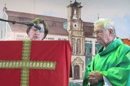 Dass Jesus seine Wunder auf einer Hochzeit begann und den Gästen Wein zum Fröhlichsein schenkte, sieht Sperl als besonderen Hinweis Gottes, sich am Leben auch freuen zu dürfen. Die Volksfesthalle war sehr gut besucht. Vielleicht erinnerte sie den Steyler-Pater mehr an seine Gotteshäuser in Ghana als der von ihm so verehrte „Dom der Hallertau“. Sperl: „Meine afrikanischen Gläubigen sind immer fröhlich, ja sogar ausgelassen glücklich“. Er meinte es ehrlich. Selbst 1. Bgm. Jens Machold schwärmte vom 78-jährigen. Und die Marktkapelle spielte mit Begeisterung. Alt-Bürgermeister Hans Frank und Messnerin Irene Kürzinger oblag wie jedes Jahr der verantwortungsvolle Rücktransport der Hostien in die Pfarrkirche.