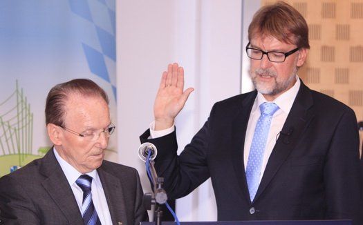 Erich Deml (CSU) nimmt dem neugewählten Landrat Martin Wolf den Amtseid ab.