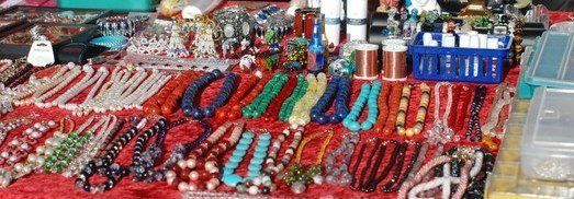 Schaurige Pierrots aus den Achtzigerjahren, Weihnachtsmann-Salzstreuer und ein gerahmtes Bildnis der Kaiserin Elisabeth hinter Glas, auf einem bedrucktem Papperdeckel. Und staubige Videokassetten, dass man schon vom Hinschauen eine Gänsehaut bekommt. Wie soll man heute einem Kind erklären, was eine Videokassette ist? Ja, möchte man seufzen beim Anblick einer Backform in Gestalt eines Fischskeletts, es gibt halt so viele verschiedene Arten, wie Sachen schön sein können. Und bestimmt gibt’s auch Leute, die so hübsche Gebrauchtaschenbecher mit Brauereiaufdruck sammeln. Bloß an dem Schmuckstand, bei den aufgefädelten Perlenketten, da war dann wirklich eine dabei, die hätte sie sich fast gekauft, unsere Reporterin. War aber heute nicht in der Stimmung auf die obligatorische Feilscherei. Und dann hat sie´s halt sein lassen und hat den Kindern dafür einen Kartoffelsalat gekauft. Was wär doch die Welt ärmer ohne Flohmarkt.