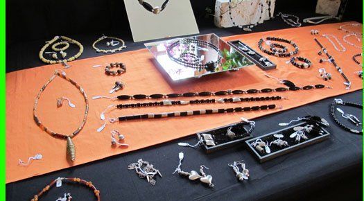 Die Bildimpressionen rühren vom Eröffnen der Ausstellung am Samstagmorgen. Doch vor Ort hatte der erste Besucher schon ein „lachendes Pferd“ erstanden. Diese Keramiken liegen schon bei 300 bis 400 €. Sie haben oft einen akademischen Hintergrund in der griechischen Mythologie. Wenn der Schöpfer eben ein echter Professor ist. Der Schmuck stammt ausschließlich von Jutta Weichmann. Entweder fertigt sie die Glieder der Ketten selbst als Keramik oder sie setzt echte Steine ein. Das kann auch mal Granit sein. Die Form- und Farbkombinationen zeigen sich verführerisch. Wer das Preisschild sieht, fragt schnell, ob nicht eine Null vergessen wurde. Denn als Modeschmuck können diese Kunst-Unikate nicht bezeichnet werden. Da hat das Christkind auch einmal selbst Weihnachten. Die Ausstellung läuft bis Sonntagabend und wiederholt sich in zwei Wochen – mit dem, was noch nicht weggekauft wurde.