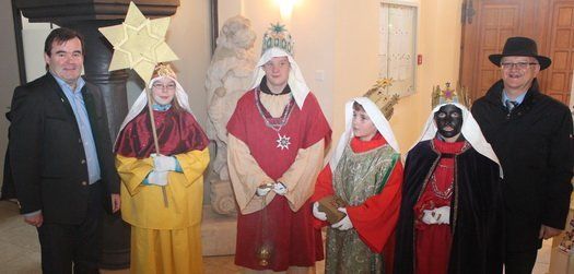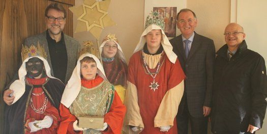 Auch Landrat Martin Wolf konnte sich über ihren Besuch freuen. Beim Empfang in seinem Büro bedankten sich die Ministranten alias Kaspar, Melchior und Balthasar für die Spende.