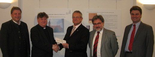 Darüber hinaus aber widmet sich die Ausstellung in informativ gestalteten Bildtafeln auch den wichtigsten Stationen der Kirchengeschichte, die vor mehr als 400 Jahren ihren Anfang nahm. Siegmund dankte in seiner Eröffnungsrede besonders dem Historischen Circel um Rudi Pfab und Hans Biberger, die gemeinsam mit dem Historiker Andreas Sauer nicht nur am „Wolnzach-Buch“ zur 2014 anstehenden 1200-Jahr-Feier arbeiten, sondern auch diese Ausstellung maßgeblich mitgestalteten. Für die gegenwärtig anstehenden Renovierungsarbeiten an der Wolnzacher Pfarrkirche durfte er an Pfarrer Johann Braun einen Scheck über 2000 € überreichen, einen Betrag, der von der großzügige Unterstützung des Domspatzen-Konzerts durch die Sponsoren Sparkasse, E.on Bayern und Kastner AG ermöglicht wurde.