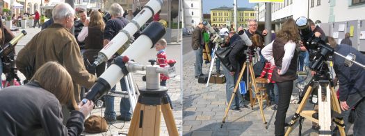 Die Teleskope waren auf die Sonne gerichtet vor dem Pfaffenhofener Rentamt. Der astronomische Terminkalender führte für diesen Tag zwar kein besonderes Himmelsschauspiel, das es zu beobachten gab, aber seien wir mal ehrlich: ist nicht unsere Sonne mit den sie umgebenden Planeten nicht schon von Haus aus etwas ganz Besonderes? Die aufgestellten Teleskope machten es möglich, Sonnenflecken und -eruptionen sehen zu können.