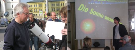 Im Vortragssaal des Rentamts gab es parallel zur Sonnenbeobachtung einen Gesamt-Überblick unseres Sonnensystems. Die Physiklehrer des Schyren-Gymnasiums, Hans Kern und Bernhard Laux, reisten mit den Zuhörern quasi durch das Sonnensystem und stellten anschaulich Fakten schier unglaublicher Dimensionen vor.