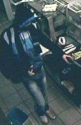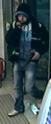 Der Täter trug bei der Tat ein dunkles Kapuzenshirt mit Reisverschluss. Das Vorderteil ist mit breiten weißen und blauen Querstreifen gemustert. Er trug zusätzlich eine blaue, leicht ausgewaschene Jeans und helle Schuhe. Während der Tatausführung maskierte er sich mit einem zunächst, um den Hals getragenen dunklen Schal. Der Mann ist ca. 170 cm groß, schlank und ca. 25 Jahre alt.
