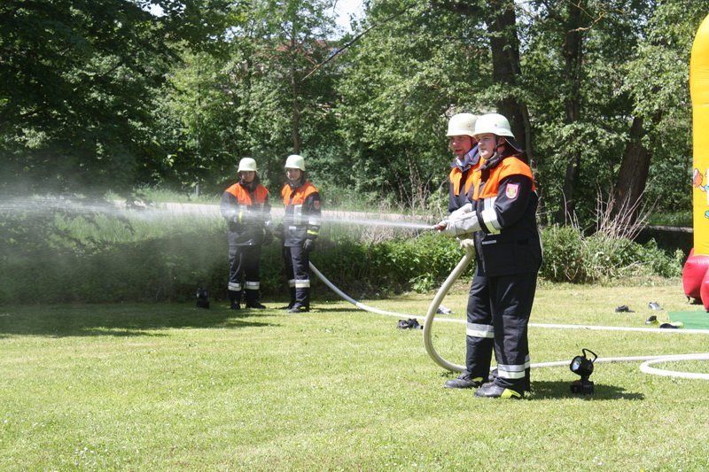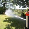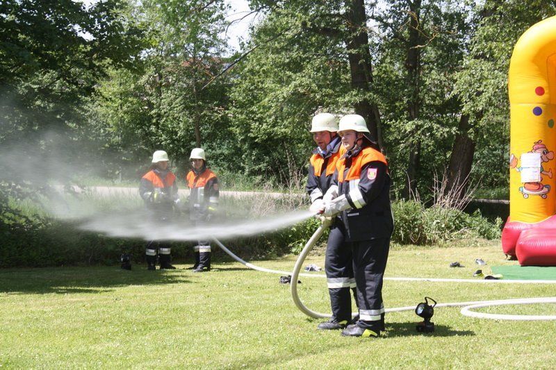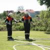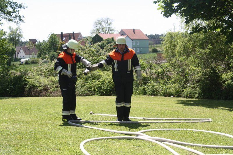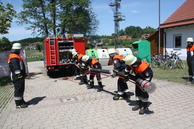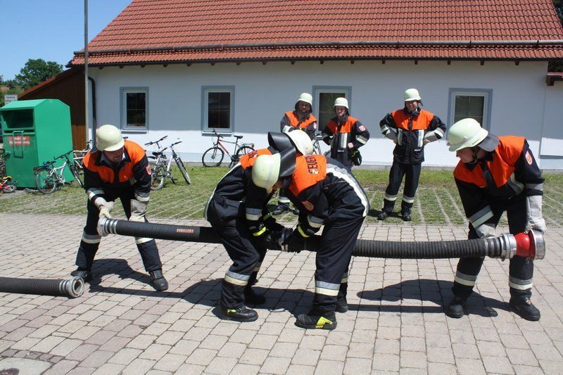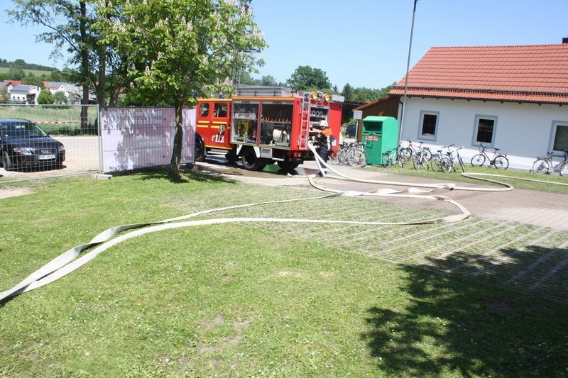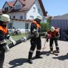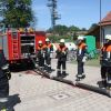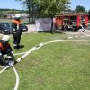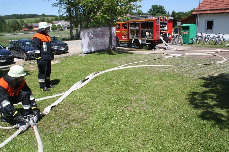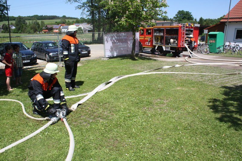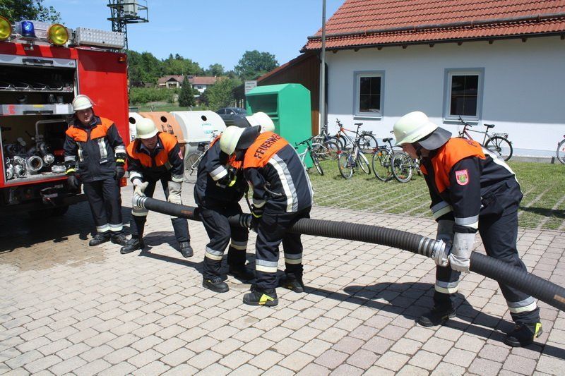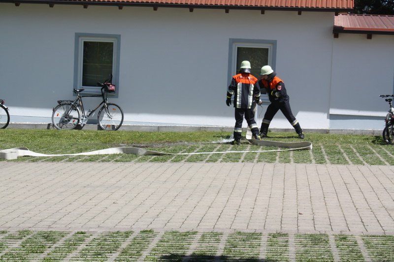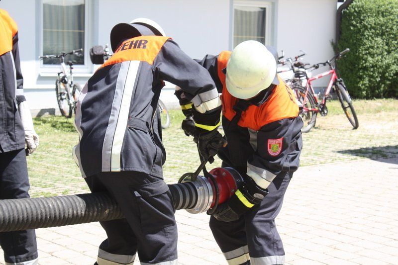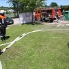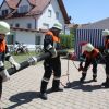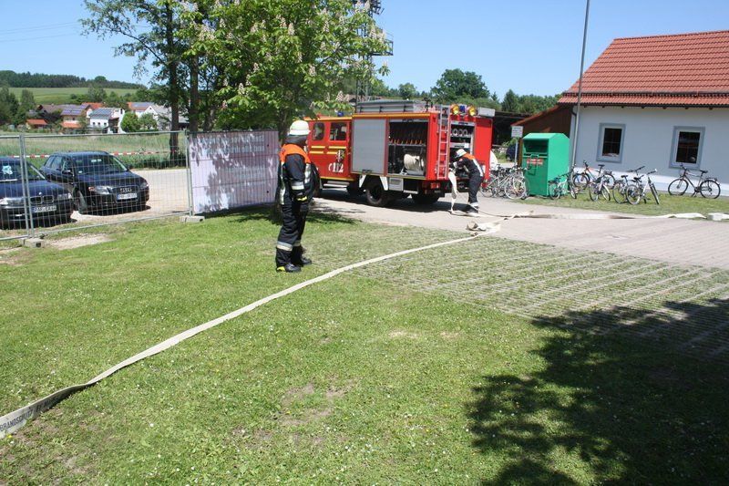 Und dass die Feuerwehrler auch wirklich auf Zack sind, dass stellten sie, bei einer Löschvorführung unter Beweis. Unter den Augen zahlreicher Zuschauer und Gemeinderäte konnten sie ihr neues Fahrzeug zum ersten Mal erproben. Rund drei Minuten ist die Zeitvorgabe spätestens dann muss es heißen“ Wasser marsch!“, so Thomas Hartleitner. Und die neun Männer enttäuschten ihren Kommandanten nicht. Zwar platzte gleich bei der ersten Übung ein Schlauch, doch in Minutenschnelle wurde dieser gewechselt und so das Ziel der Übung erreicht.
