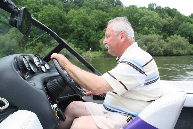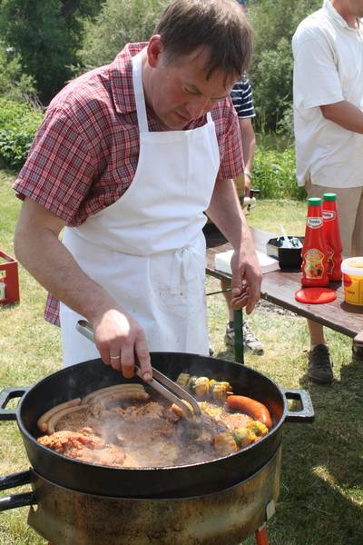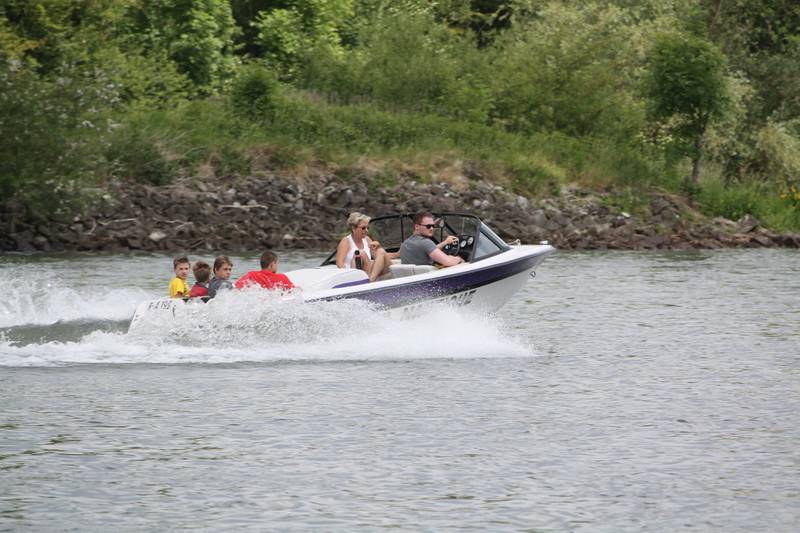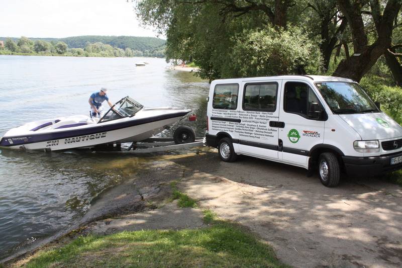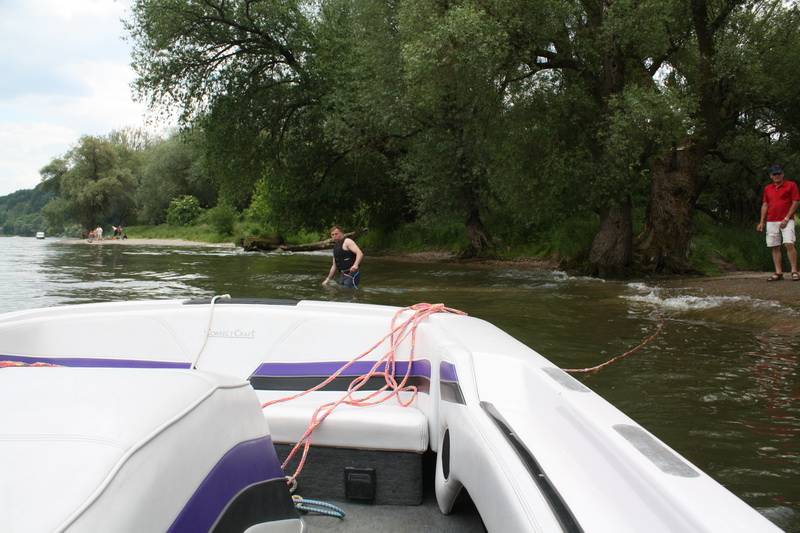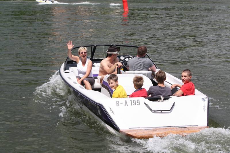 Bevor man jedoch das auf Hochglanz gebrachte Boot zu Wasser ließ, ließ man sich zunächst einmal die Köstlichkeiten von Grillmeister Franz Reichold schmecken. Dann um kurz vor zwei Uhr war es so weit, die Ski Nautique wurde zu Wasser gelassen. „Rund 80 km/h fährt das kleine Boot“, erklärte Karl Werther, Vorstand des SWCs und viele Kinder konnten es nicht erwarten einmal mit Vollgas über die Donau zu brettern.