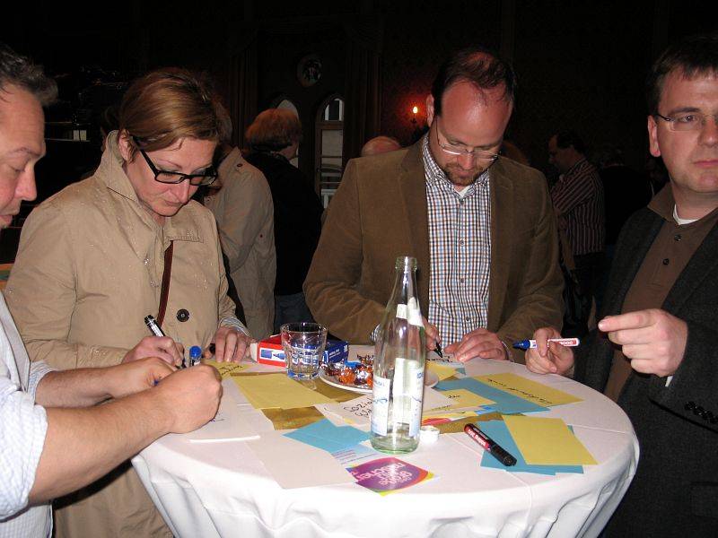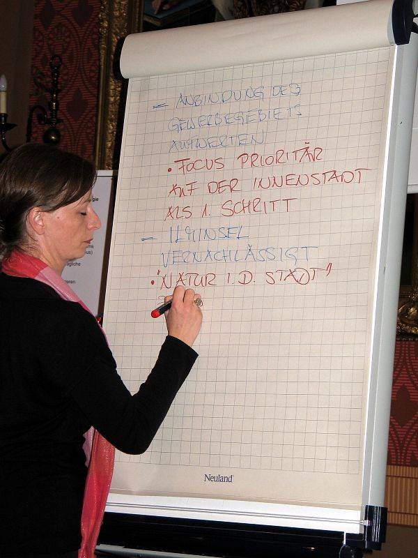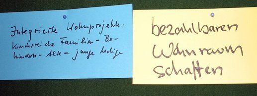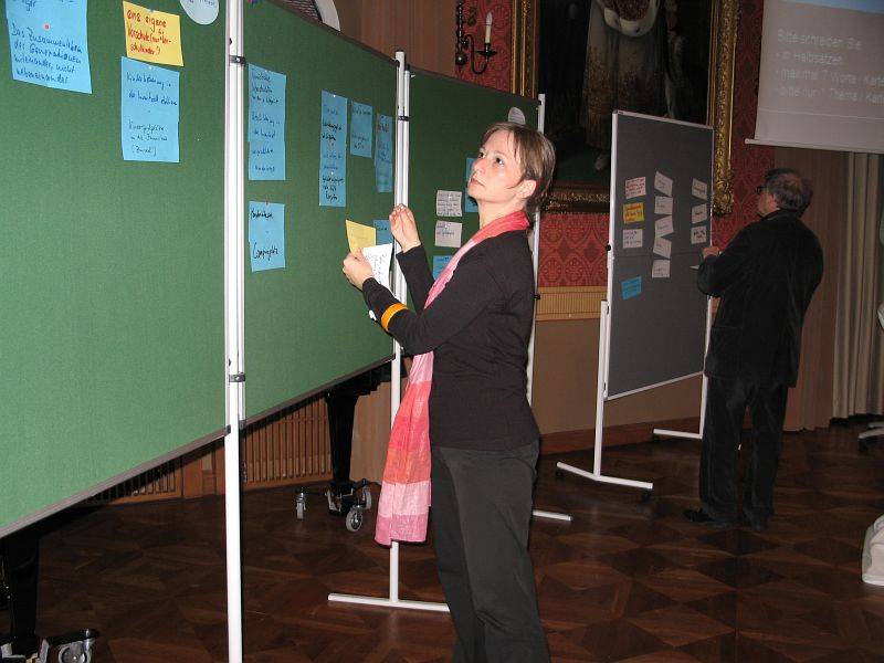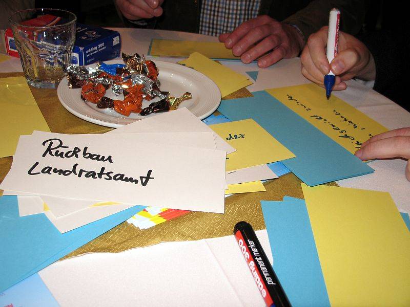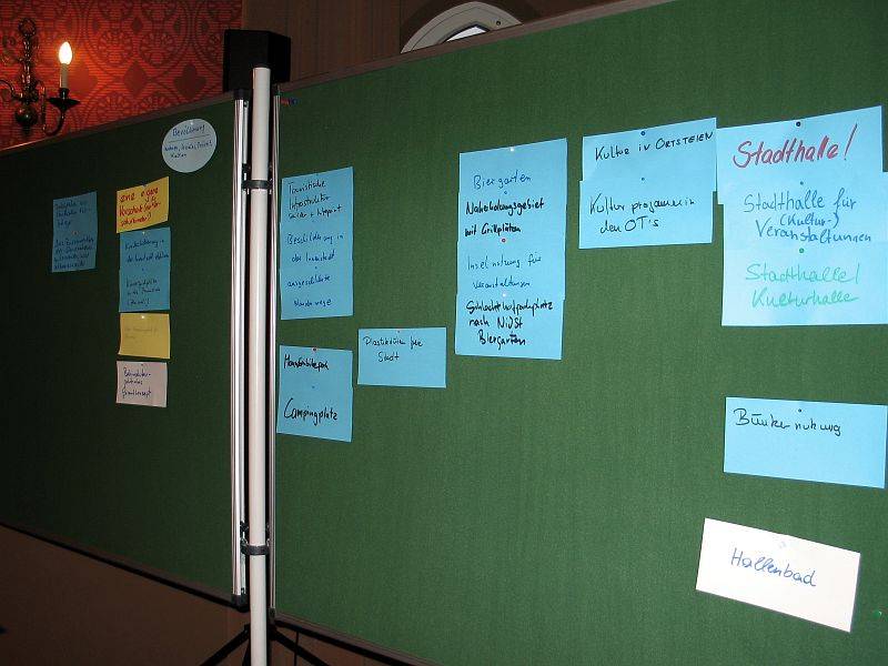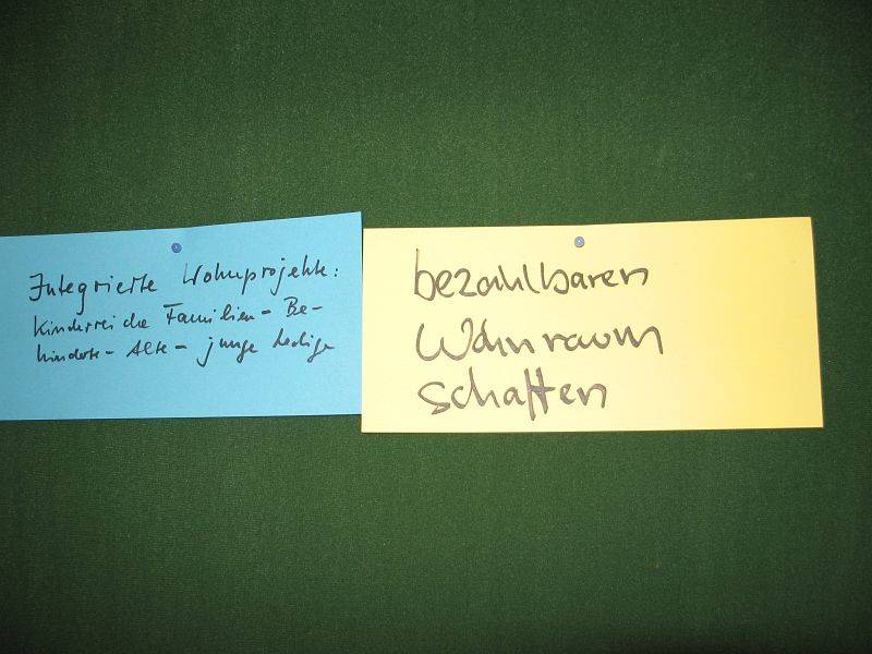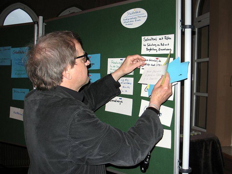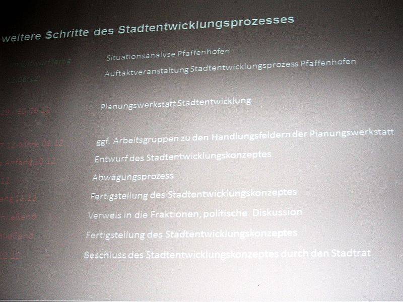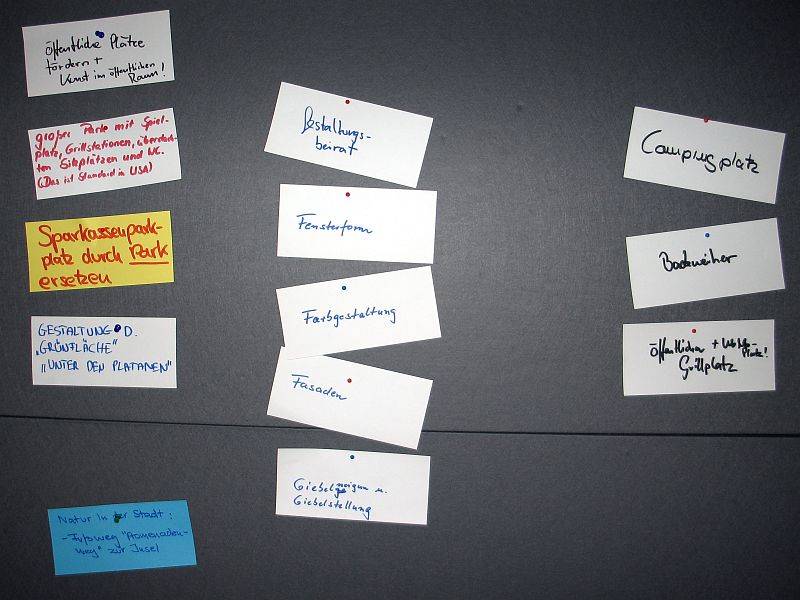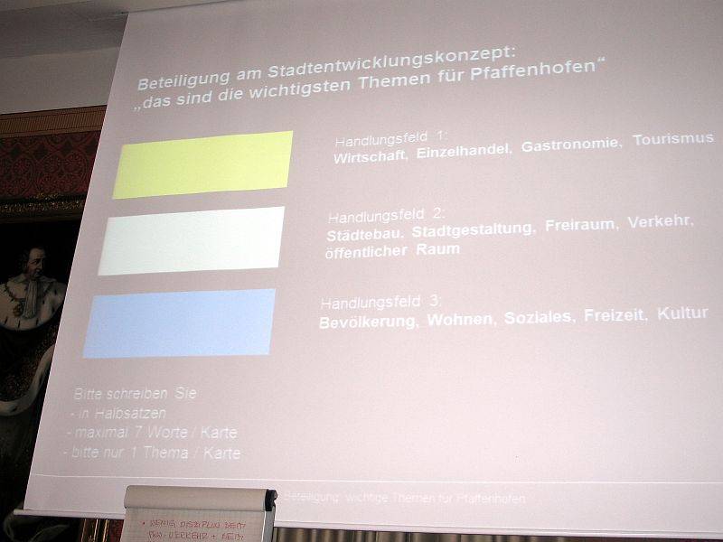 Schließlich bekam jeder, der sich einbringen wollte, die Möglichkeit, dies per Stichpunkte auf bereitliegenden Kärtchen zu tun. Die Pinwände reichten kaum aus, um die große Anzahl der Vorschläge aufzunehmen, weit gesprengt der Zeitrahmen. Bezahlbarer Wohnraum, Autos raus aus der Innenstadt, Car-Sharing, Stadthalle oder Integration waren vielfach genannt worden (s. Fotostrecke). Bis Ende 2012 soll das Konzept zur Stadtentwicklung stehen und soll sodann vom Stadtrat beschlossen werden. Sind noch ein paar Monate hin, vorerst geht’s in die nächste Runde bei der Planungswerkstatt am 29. und 30. Juni zum aktiven Mitgestalten. Diese Veranstaltung steht wieder allen Bürgern offen! Mehr zum Thema unter www.pfaffenhofen.de