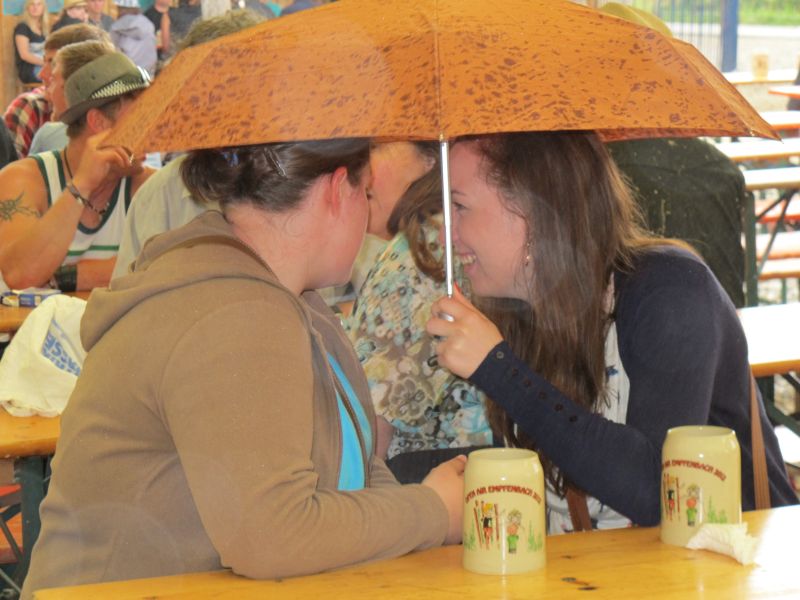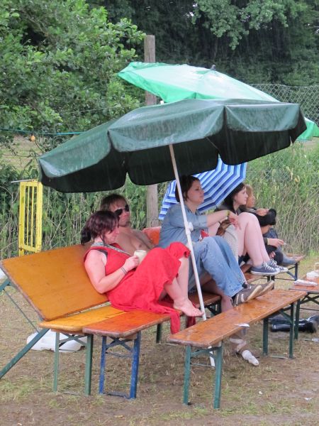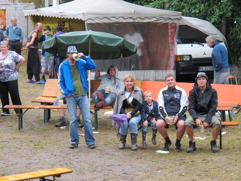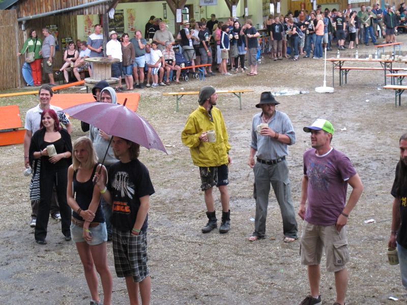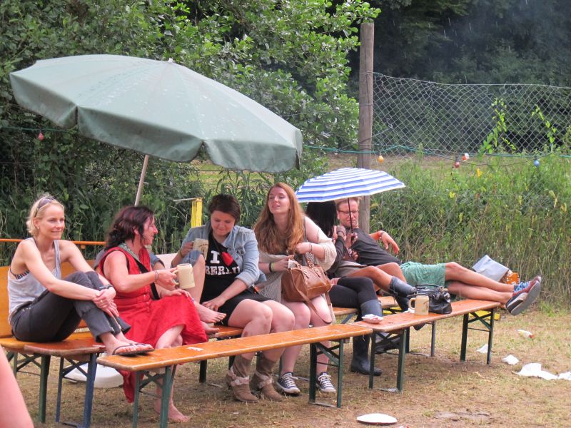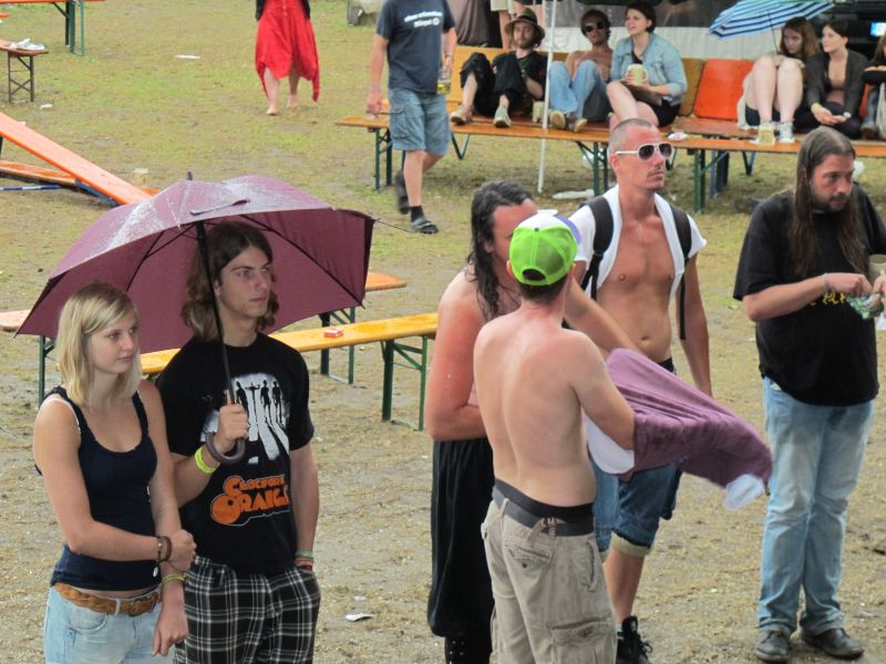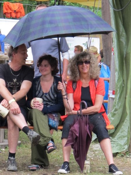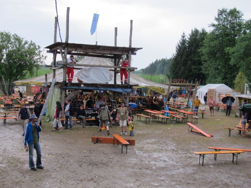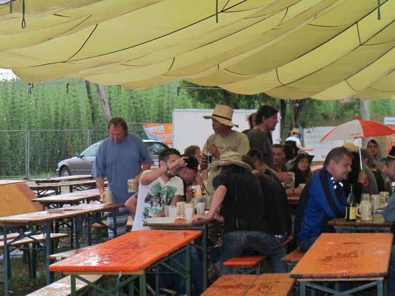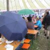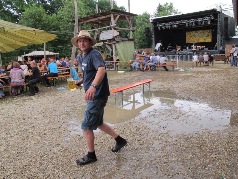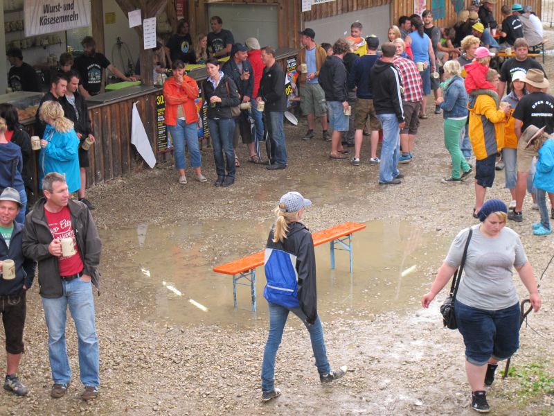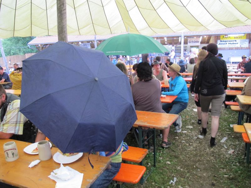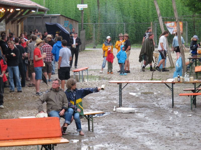 Im Nu verwandelte sich das ganze Gelände zu einem Sumpf und jeder suchte sich ein Plätzchen im Trockenen. Einige ganz Pfiffige bauten sich aus Bierbänken und –tischen Überdachungen, andere benutzen Sonnenschirme als Regenschirme, wieder anderen machte das Wetter nichts aus, sie standen im Regen, sangen, tanzten und ignorierten das Sauwetter.