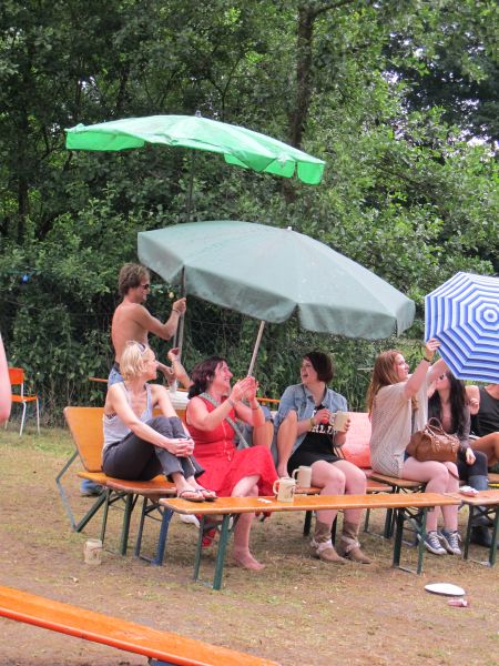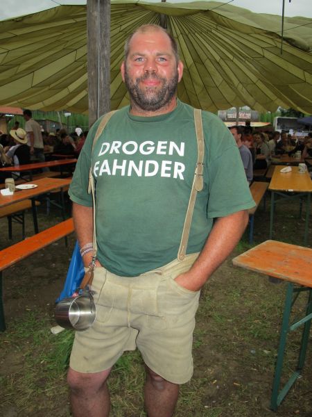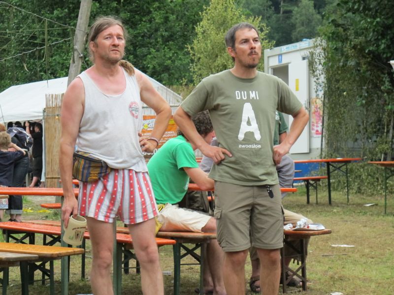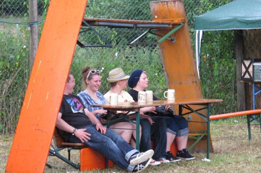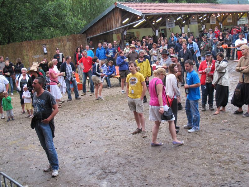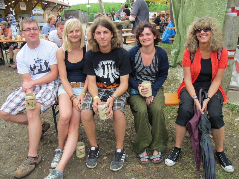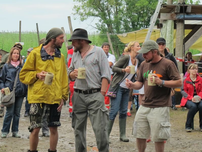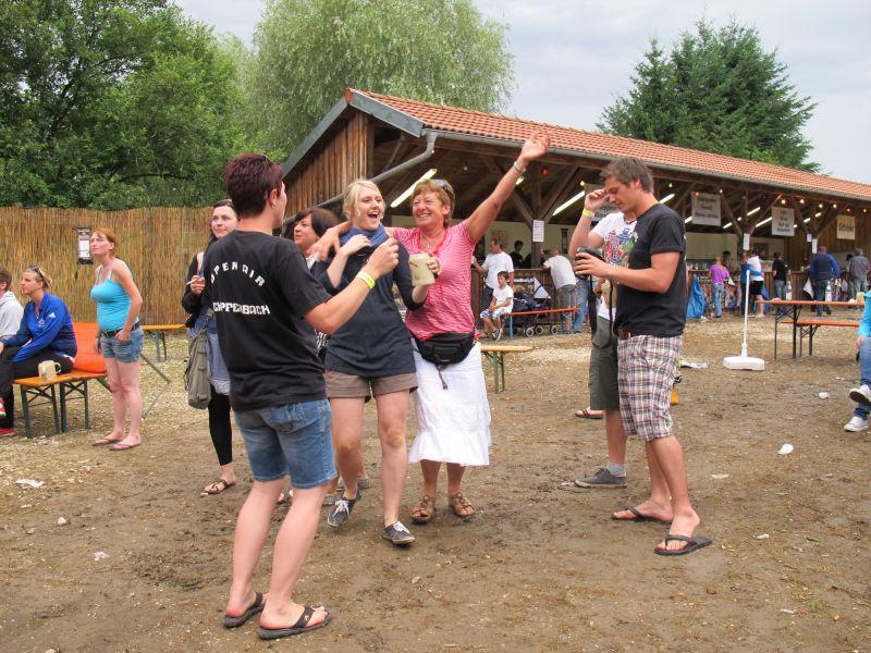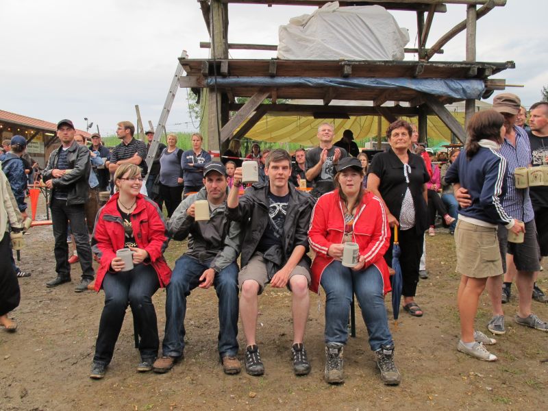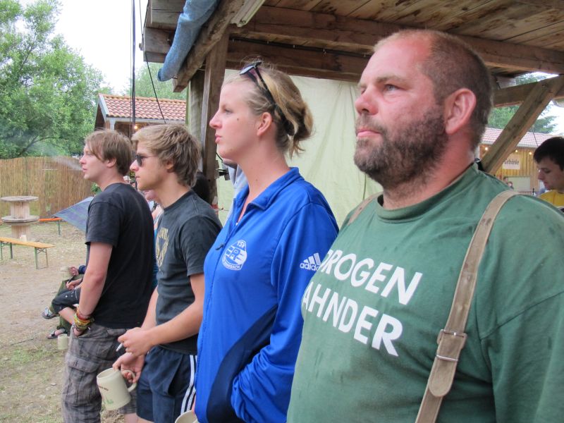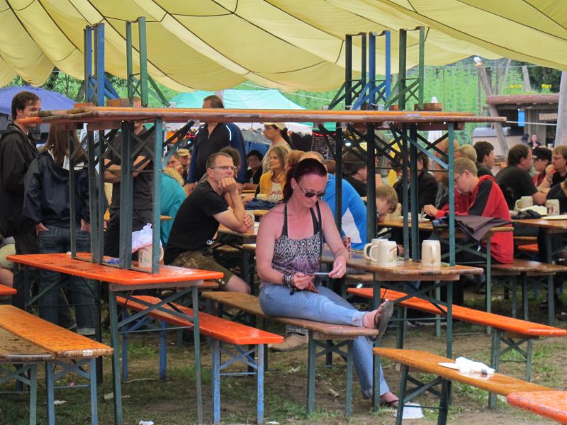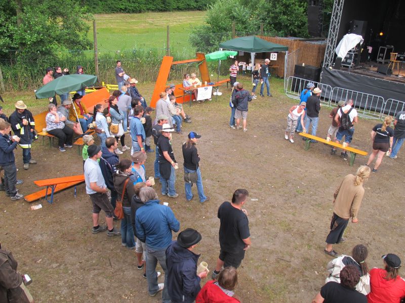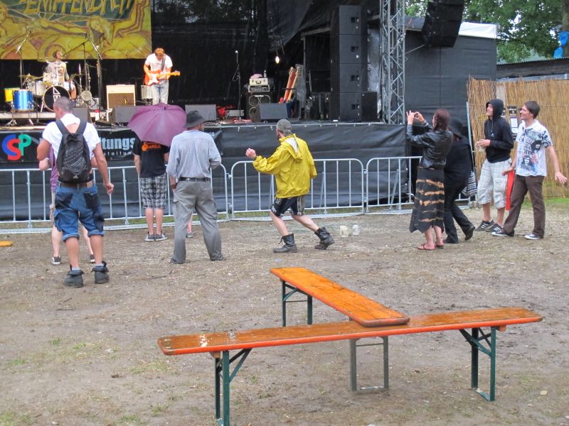 Im Nu verwandelte sich das ganze Gelände zu einem Sumpf und jeder suchte sich ein Plätzchen im Trockenen. Einige ganz Pfiffige bauten sich aus Bierbänken und –tischen Überdachungen, andere benutzen Sonnenschirme als Regenschirme, wieder anderen machte das Wetter nichts aus, sie standen im Regen, sangen, tanzten und ignorierten das Sauwetter.