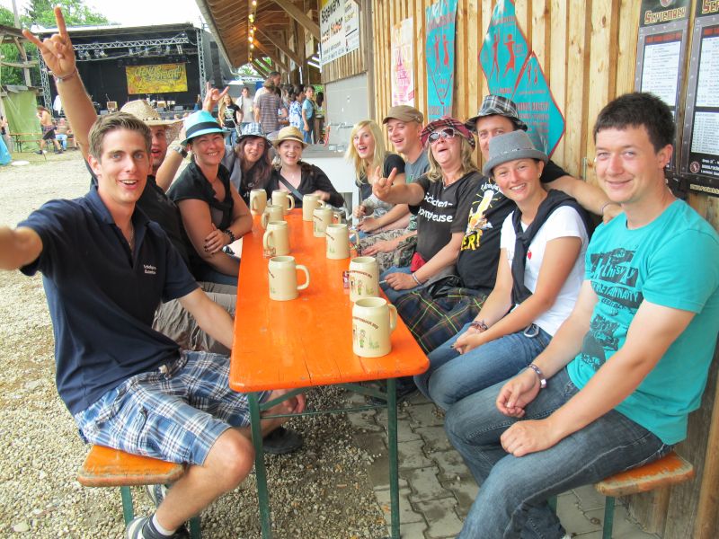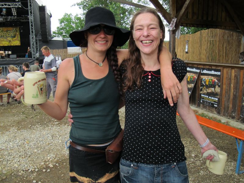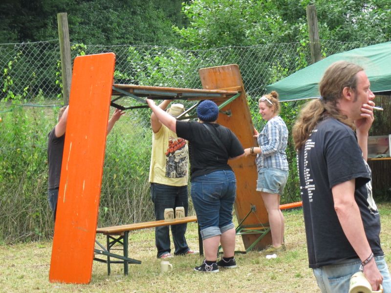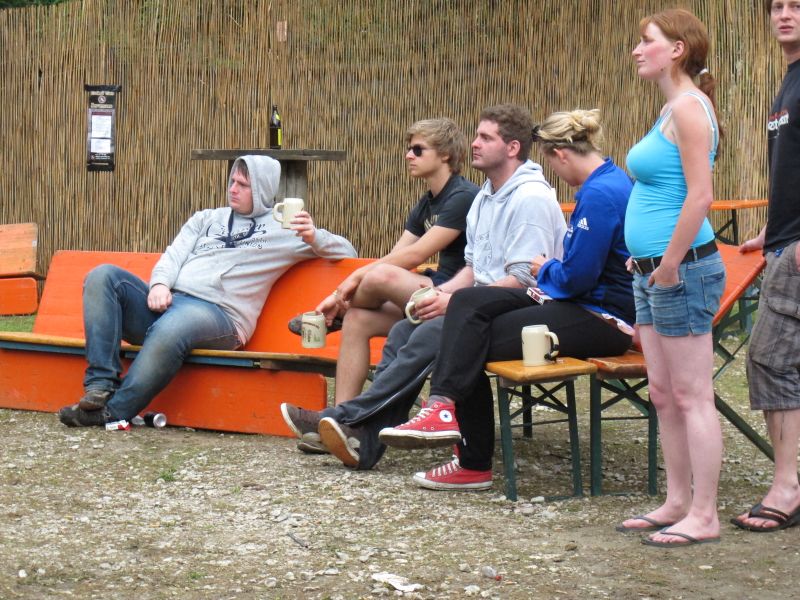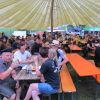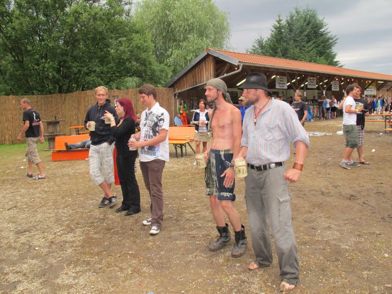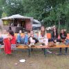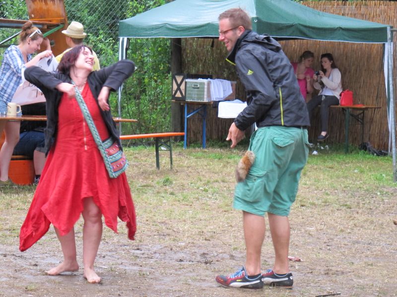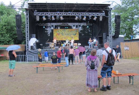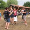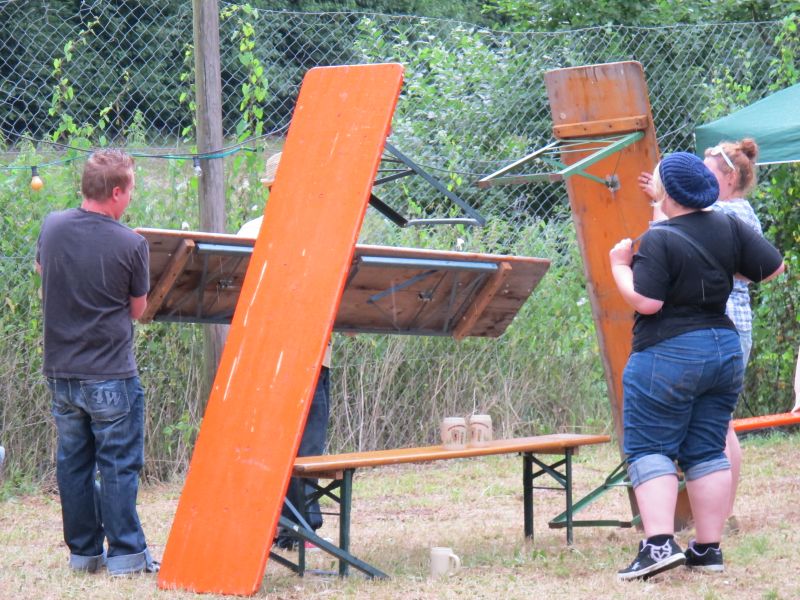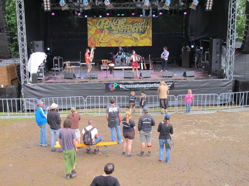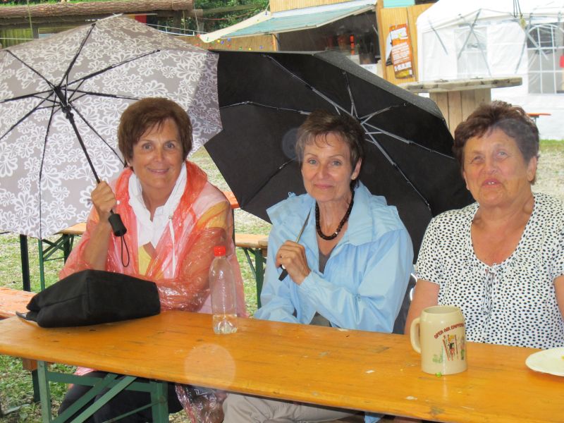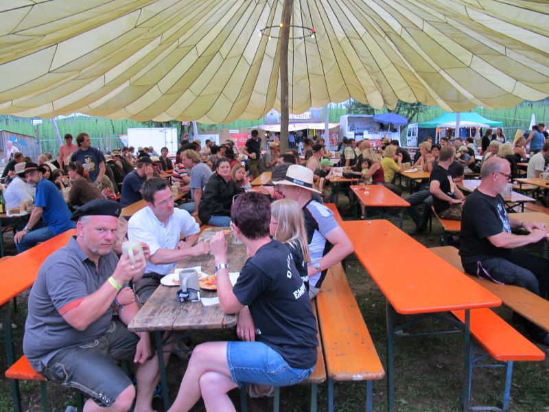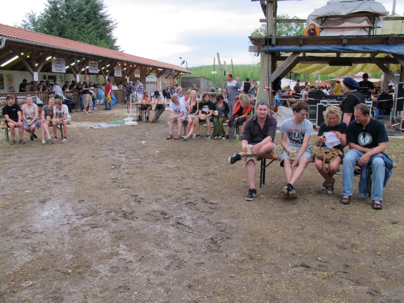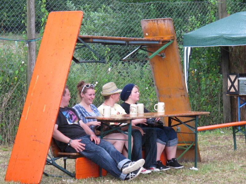 Im Nu verwandelte sich das ganze Gelände zu einem Sumpf und jeder suchte sich ein Plätzchen im Trockenen. Einige ganz Pfiffige bauten sich aus Bierbänken und –tischen Überdachungen, andere benutzen Sonnenschirme als Regenschirme, wieder anderen machte das Wetter nichts aus, sie standen im Regen, sangen, tanzten und ignorierten das Sauwetter.