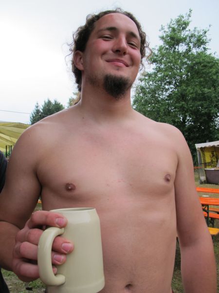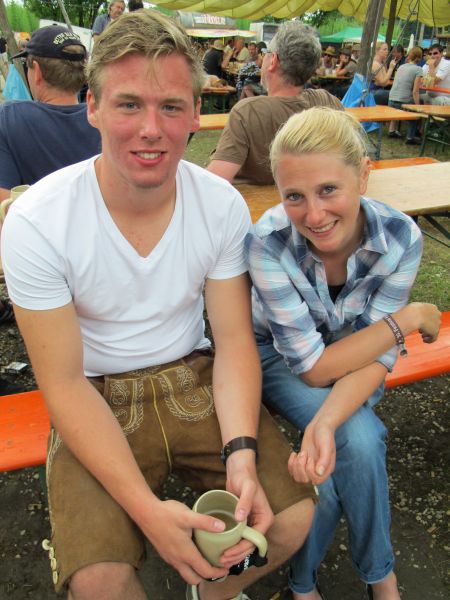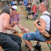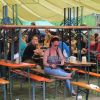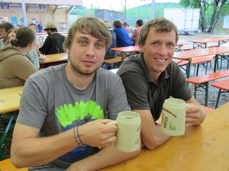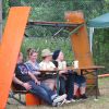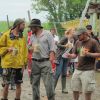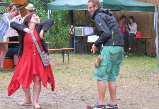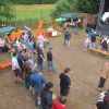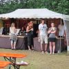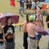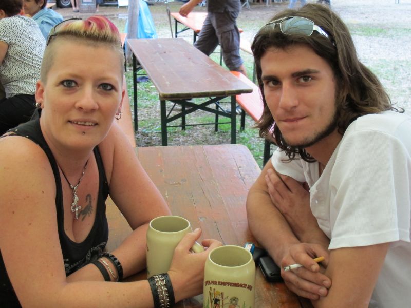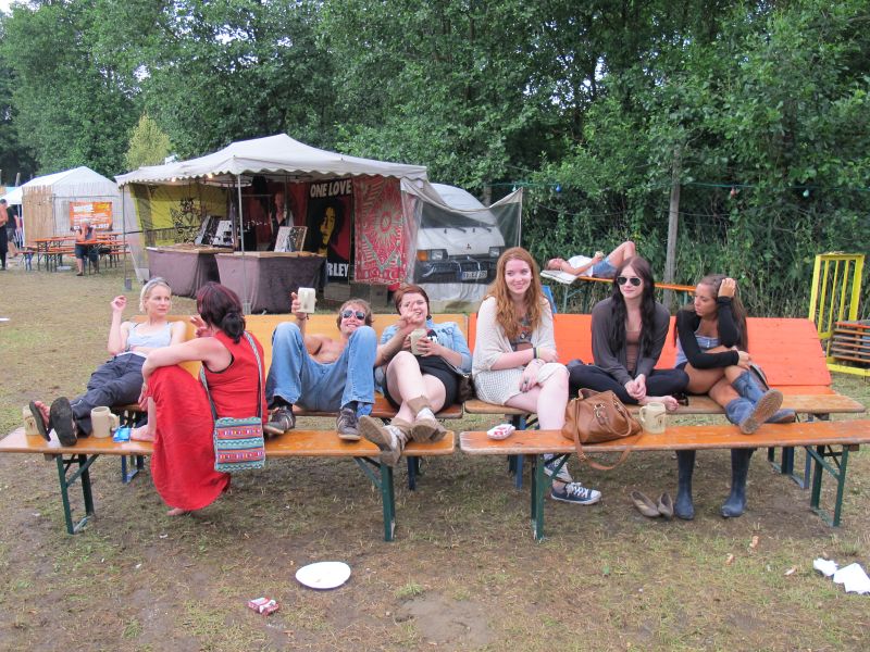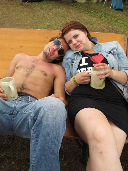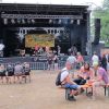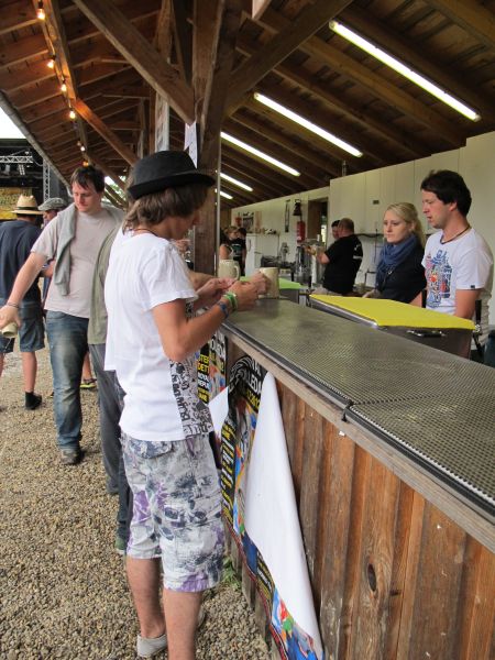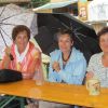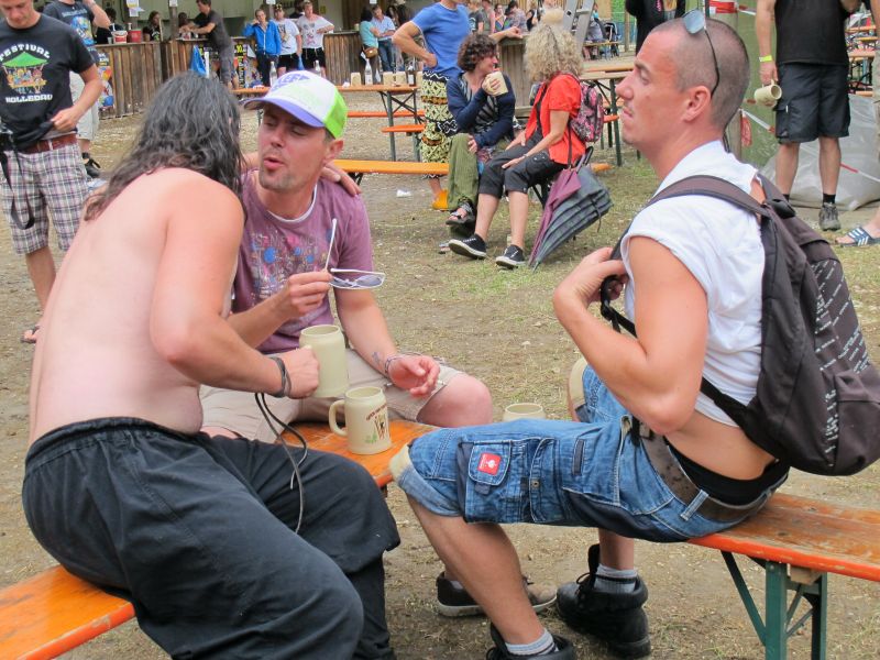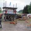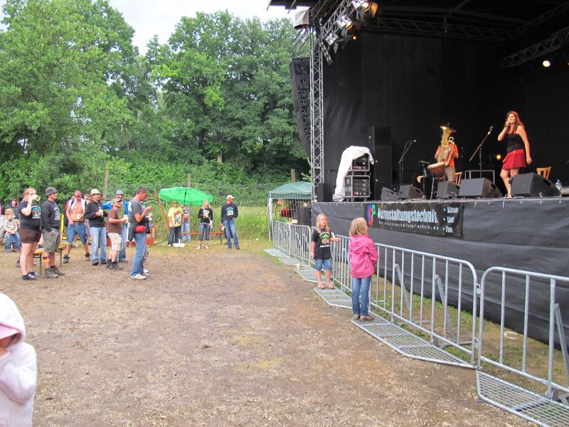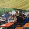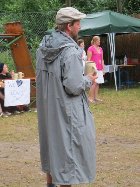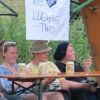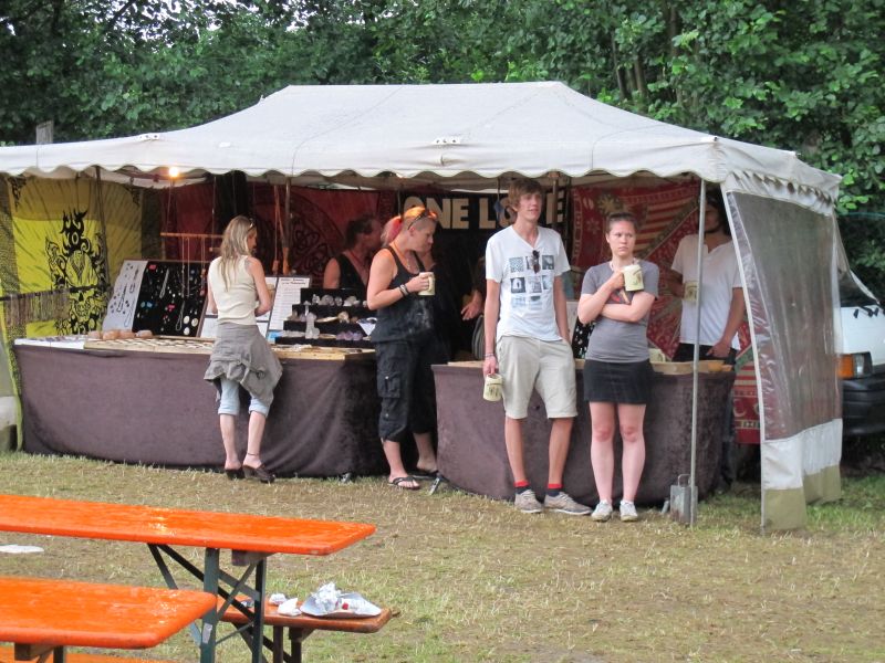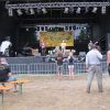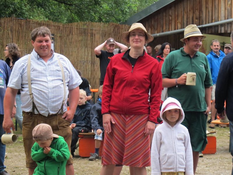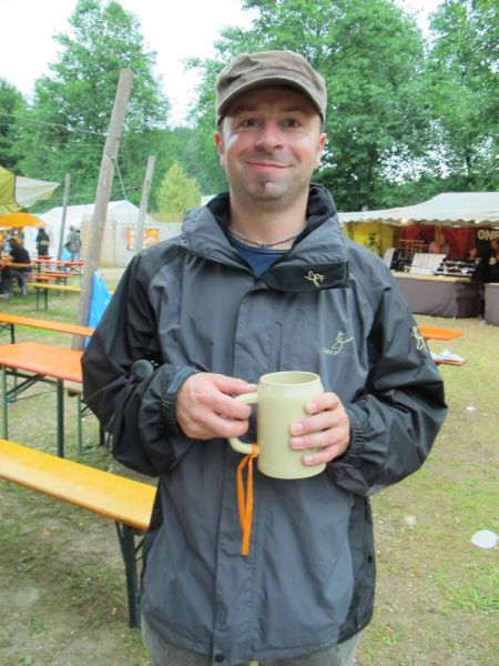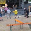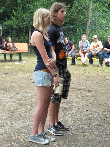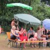 Im Nu verwandelte sich das ganze Gelände zu einem Sumpf und jeder suchte sich ein Plätzchen im Trockenen. Einige ganz Pfiffige bauten sich aus Bierbänken und –tischen Überdachungen, andere benutzen Sonnenschirme als Regenschirme, wieder anderen machte das Wetter nichts aus, sie standen im Regen, sangen, tanzten und ignorierten das Sauwetter.