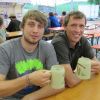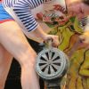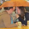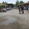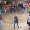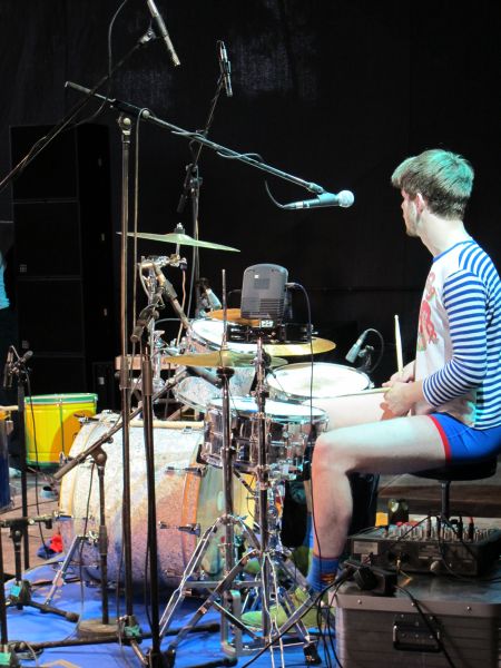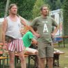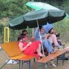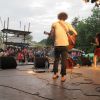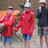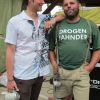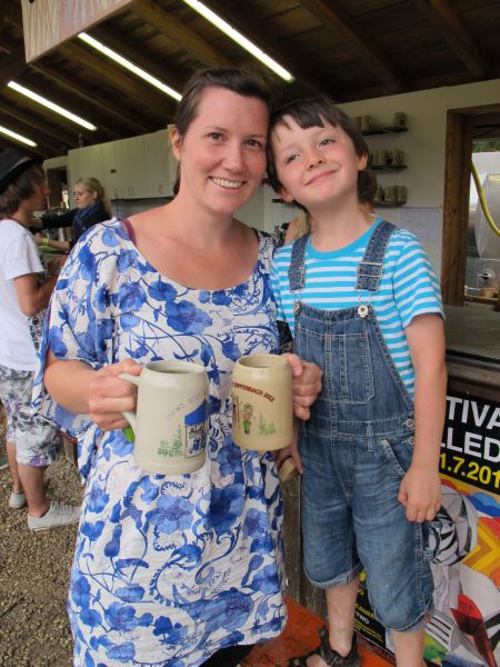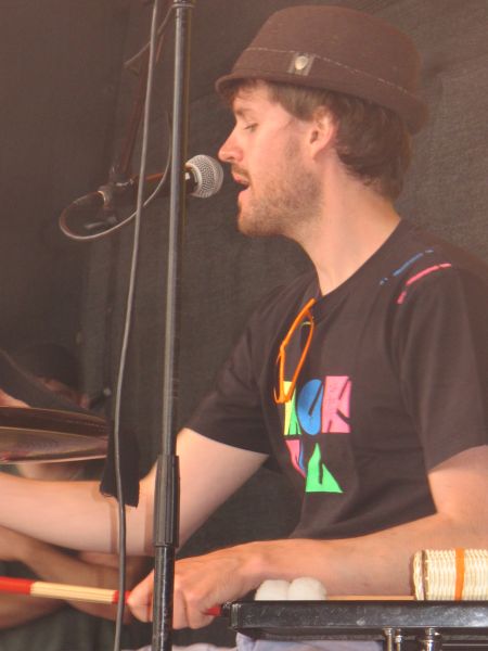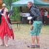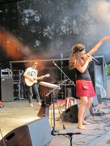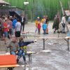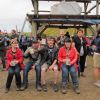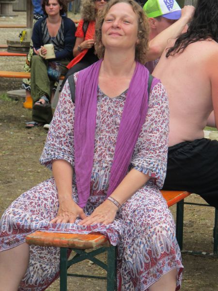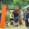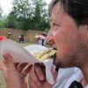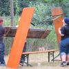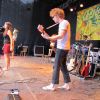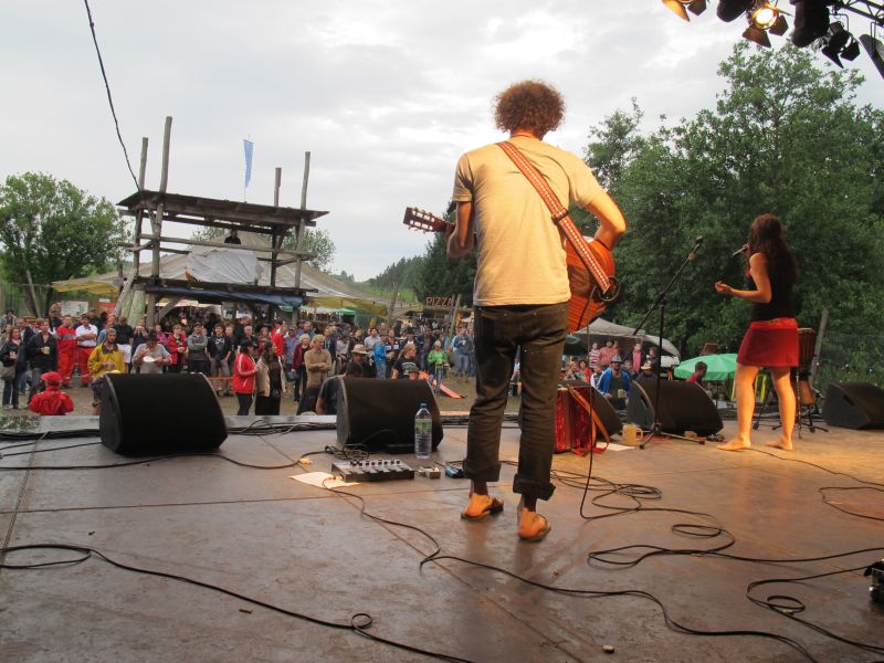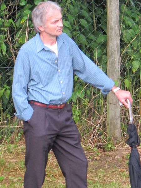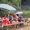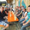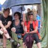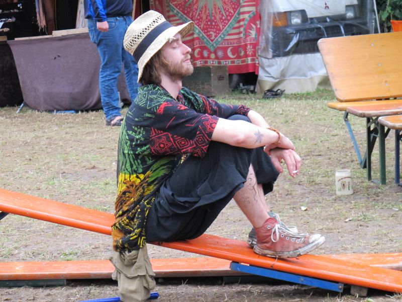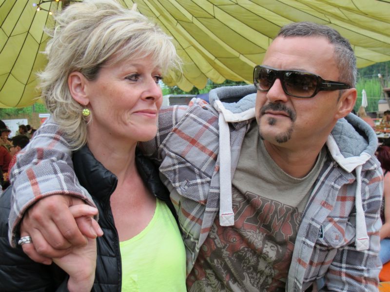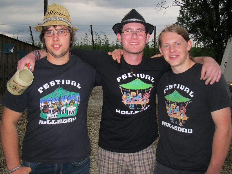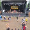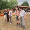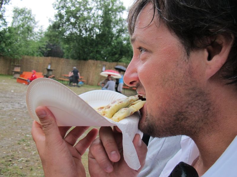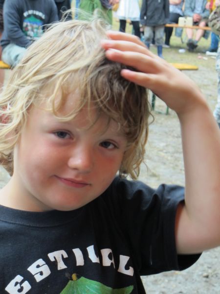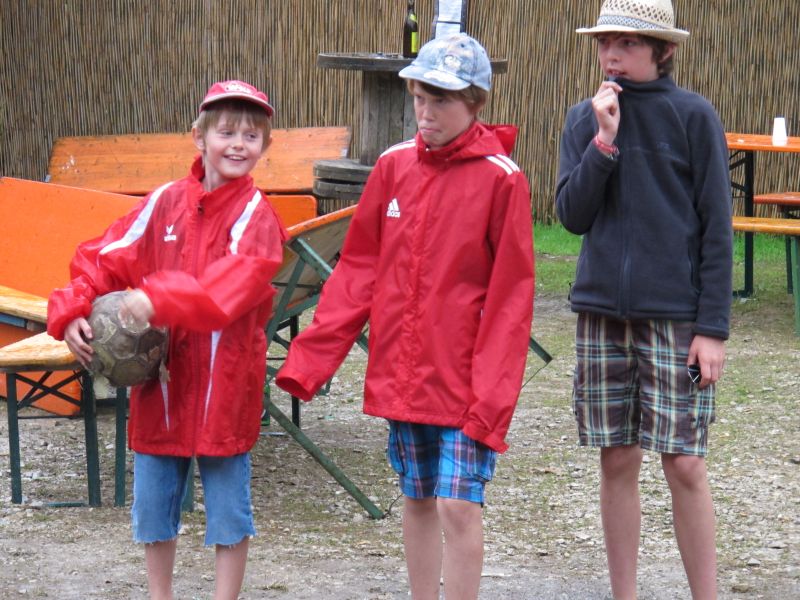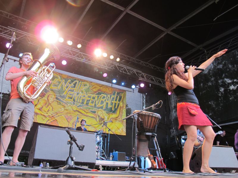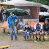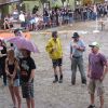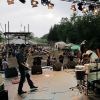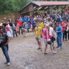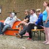 Im Nu verwandelte sich das ganze Gelände zu einem Sumpf und jeder suchte sich ein Plätzchen im Trockenen. Einige ganz Pfiffige bauten sich aus Bierbänken und –tischen Überdachungen, andere benutzen Sonnenschirme als Regenschirme, wieder anderen machte das Wetter nichts aus, sie standen im Regen, sangen, tanzten und ignorierten das Sauwetter.