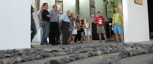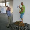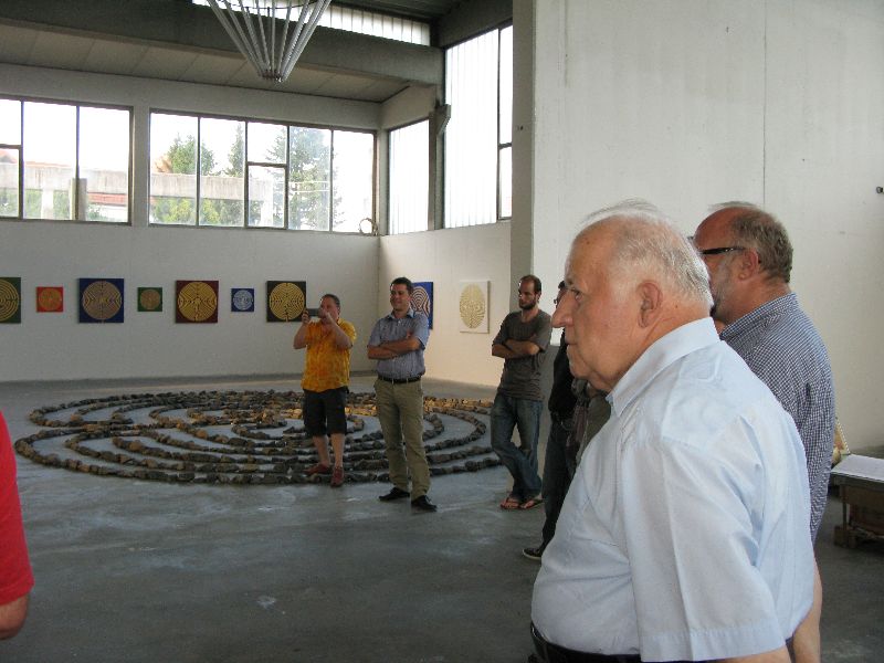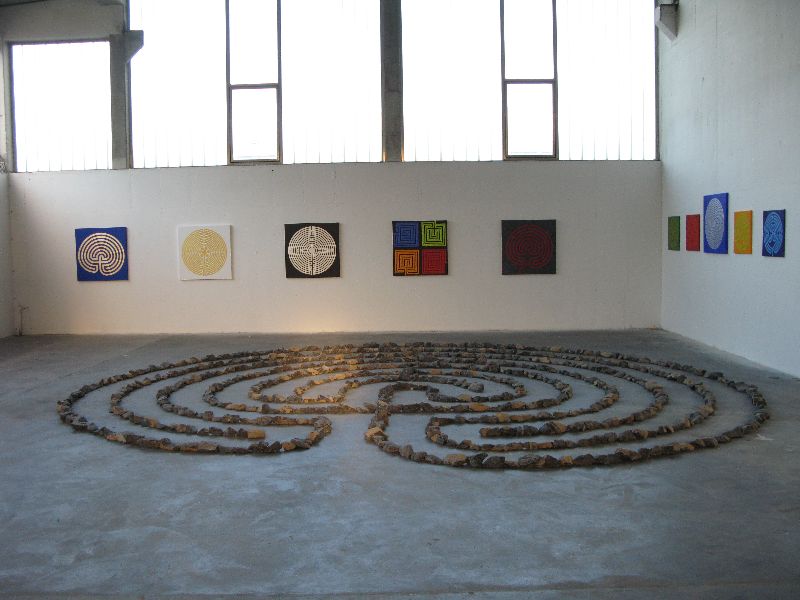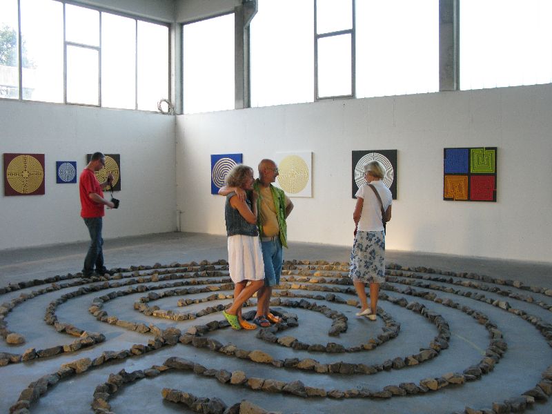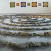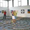 Zusammen mit seiner Frau Heike feiert er in diesem Jahr den 100. Geburtstag: Sie ist 45, er 55. Anlass genug, um ein Jahr lang in gemeinsamen Ausstellungen und Aktionen an die Öffentlichkeit zu gehen. Heike Habl setzt sich künstlerisch seit einigen Jahren mit Labyrinthen auseinander und schafft neue Interpretationen für dieses archetypische Symbol. Unter gemalten Labyrinthen unterschiedlichster Form installierte sie in der Kulturhalle einen begehbaren Ariadne-Faden, der, somit nur ein scheinbarer Widerspruch in sich, durch das Labyrinth nicht nur den Weg zeigt, sondern der Weg ist – begrenzt durch mehrere Tonnen Schottersteine.