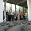 Ebenfalls von Schottersteinen umrahmt liegt der „Stein des Anstoßes“, den Manfred Habl so gerne findet und in der aktuellen Exposition als Podium benutzte, von dem aus er per Mini-Megaphon – mit orangem Mundstück, eine von des Künstlers Lieblingsfarben – einen kurzen Überblick zu Gehör brachte über sein ausgestelltes Werk. Frühwerke von 1986 unter dem Titel „Morbides aus Ton und Seide“ gesellen sich zu einer Hommage an den großen Joseph Beuys, dessen Geist Manfred Habl mit Zinkwanne, Koffer, Hut und Büchserl für die Cents seine Wunde zeigte.
