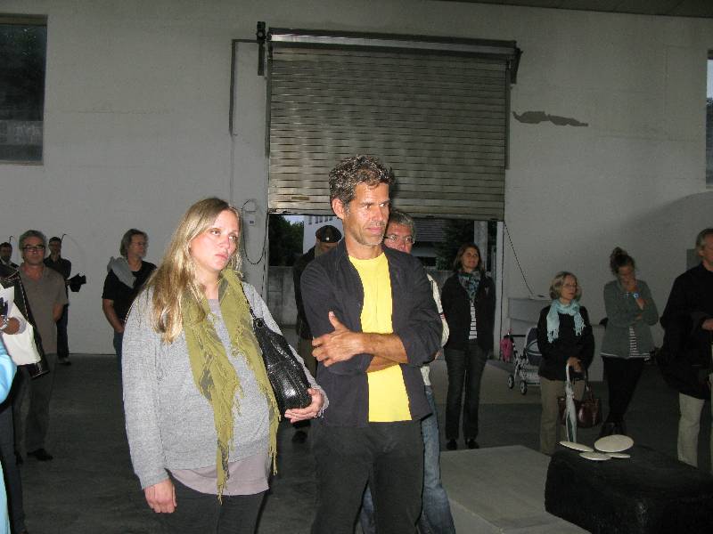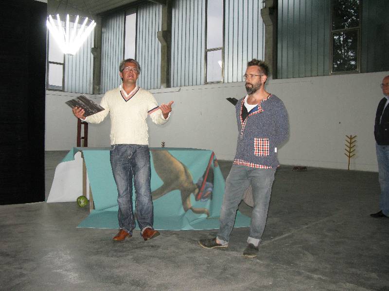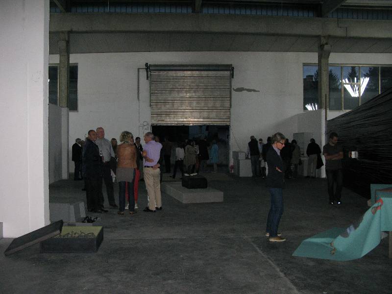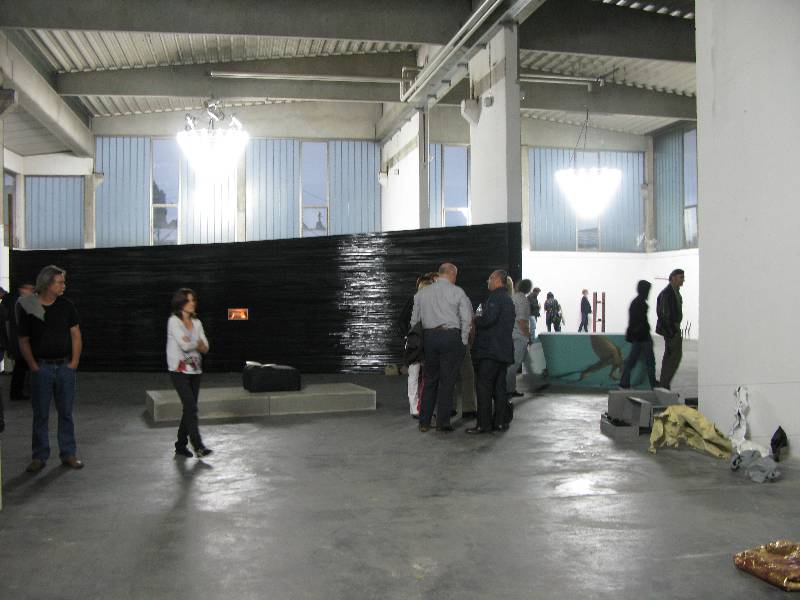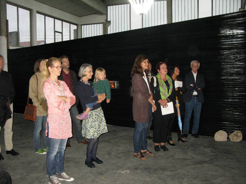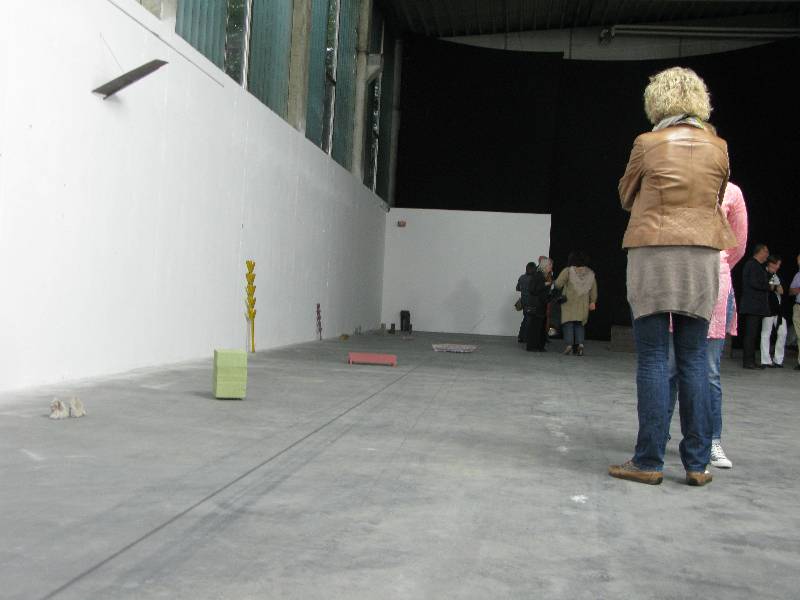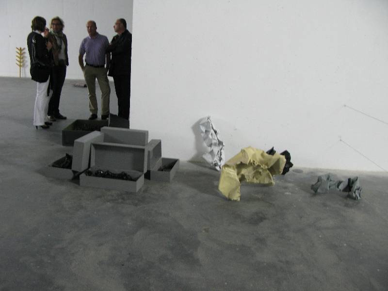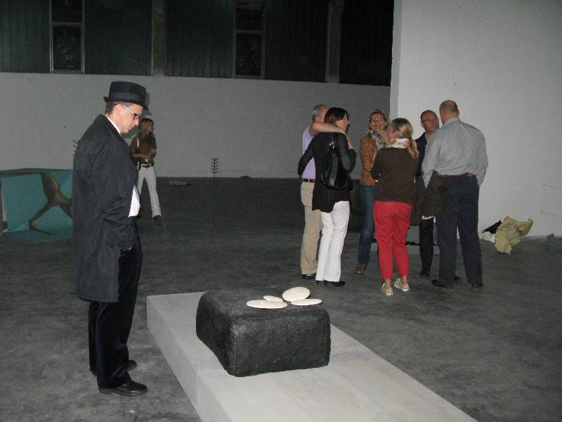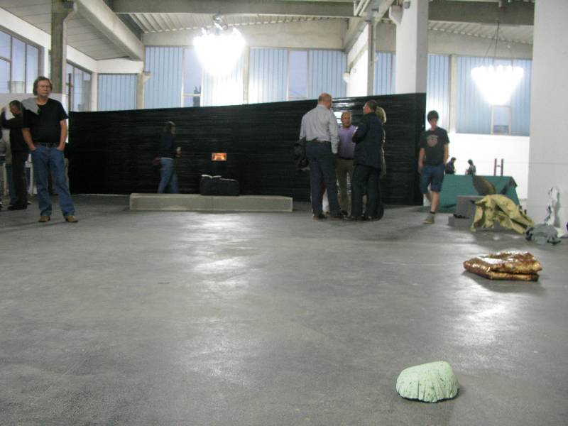 Für Wolfgang Kaiser, in gelbem (goldenen) Shirt unter schwarzem Hemd, sprechen seine Exponate – und ihre Installation. Die mit den Kaiserschen Kunstfiguren bevölkerte Kulturhalle ist zum faszinierenden Schauplatz absurder Ereignisse geworden, den der Besucher durchwandeln darf. Ein Paar Schuhe, schwarz eingefärbt und in den Raum gestellt, verlocken den Besucher zum Berühren; ebenso zieht ein zerknittertes Etwas, zwar golden glänzend, dennoch das Auge irgendwie an den verbeulten Kotflügel eines alten VW-Käfers erinnernd, die Fingerspitzen des Betrachters an, magisch eben, als würde die Optik die Haptik zu Hilfe rufen – zwei winzige rotbraune Sonnenschirme auf einem aus der weißen Wand wachsenden Mini-Balken sind leider für die tastende Hand zu weit entfernt …
