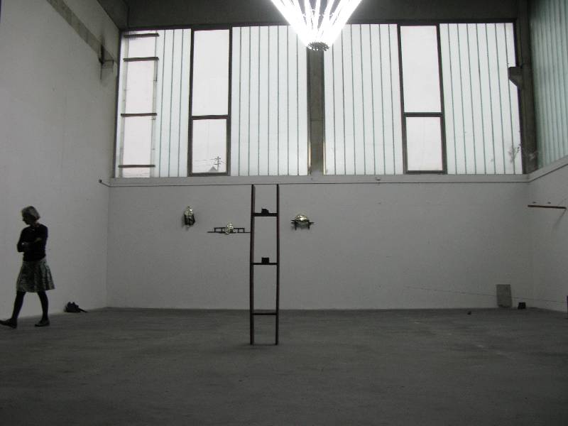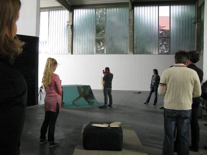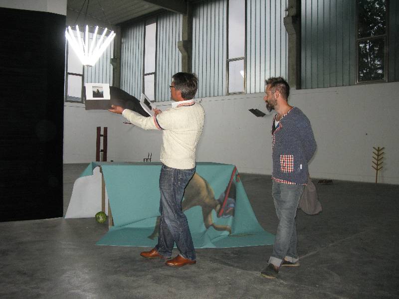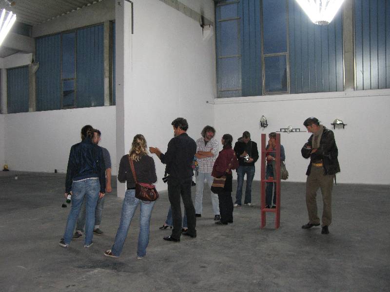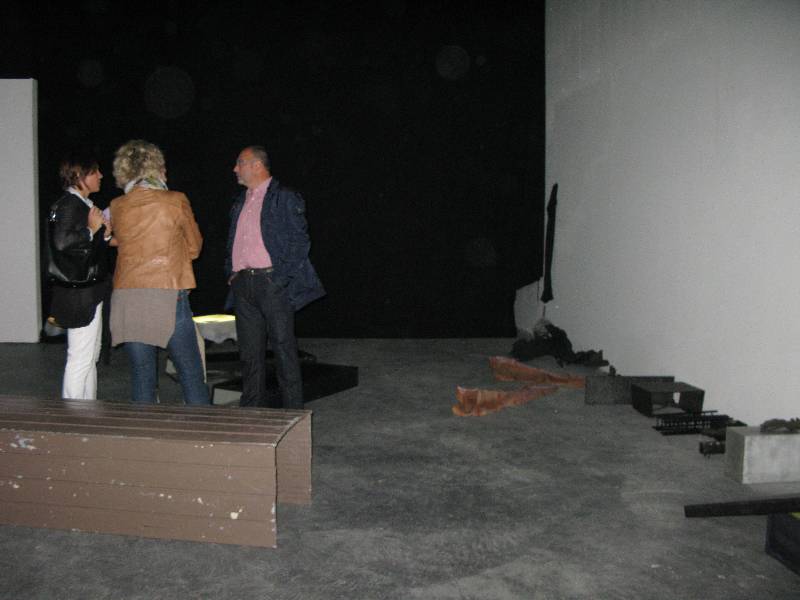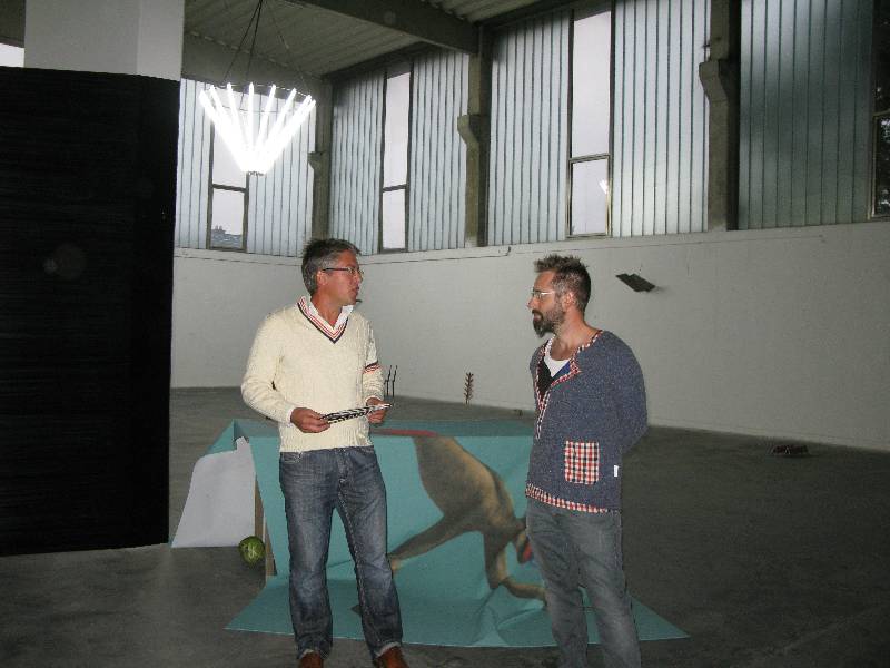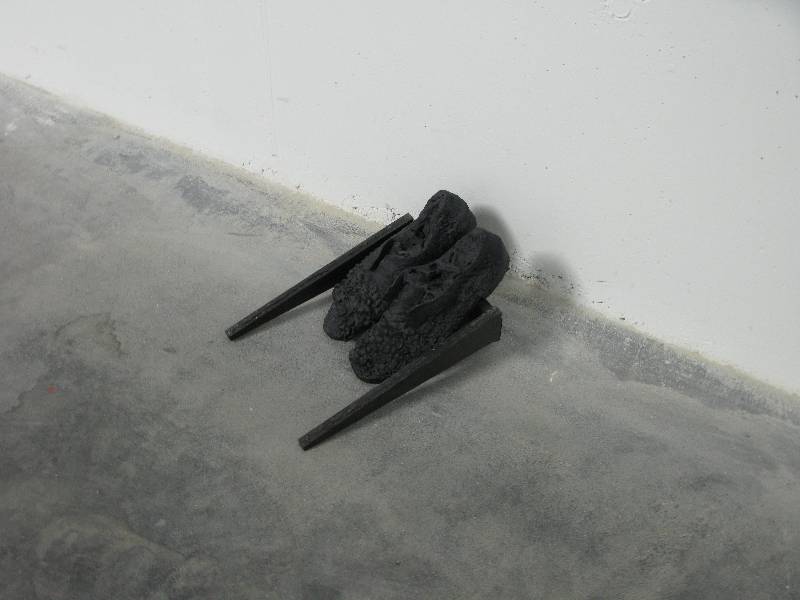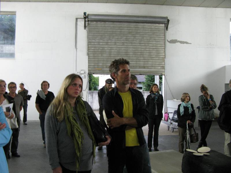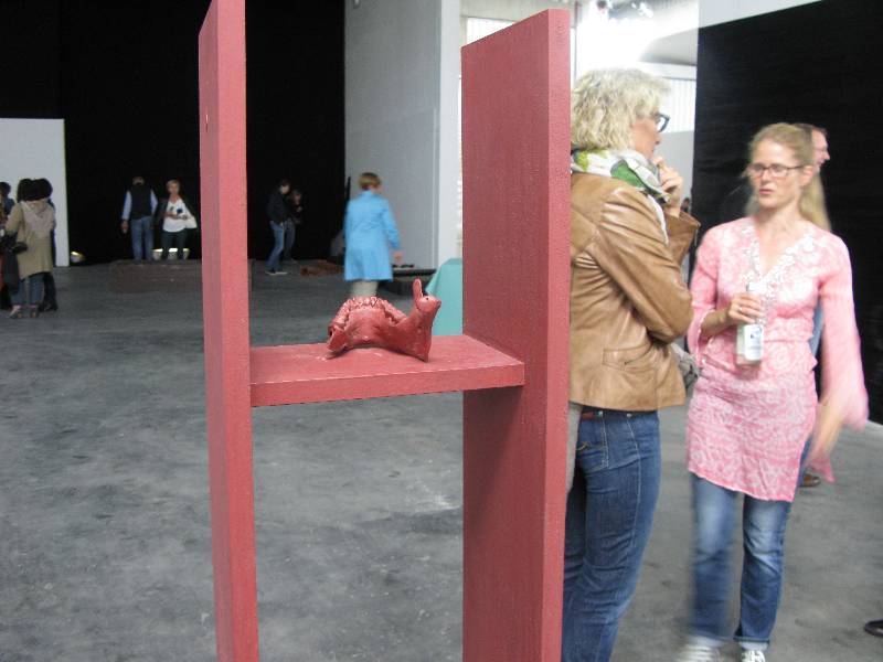 Für Wolfgang Kaiser, in gelbem (goldenen) Shirt unter schwarzem Hemd, sprechen seine Exponate – und ihre Installation. Die mit den Kaiserschen Kunstfiguren bevölkerte Kulturhalle ist zum faszinierenden Schauplatz absurder Ereignisse geworden, den der Besucher durchwandeln darf. Ein Paar Schuhe, schwarz eingefärbt und in den Raum gestellt, verlocken den Besucher zum Berühren; ebenso zieht ein zerknittertes Etwas, zwar golden glänzend, dennoch das Auge irgendwie an den verbeulten Kotflügel eines alten VW-Käfers erinnernd, die Fingerspitzen des Betrachters an, magisch eben, als würde die Optik die Haptik zu Hilfe rufen – zwei winzige rotbraune Sonnenschirme auf einem aus der weißen Wand wachsenden Mini-Balken sind leider für die tastende Hand zu weit entfernt …