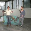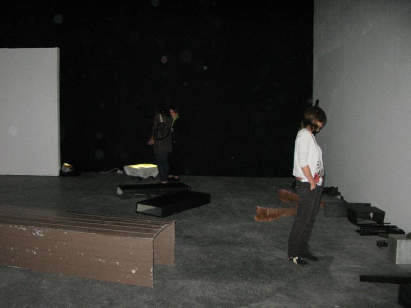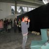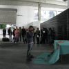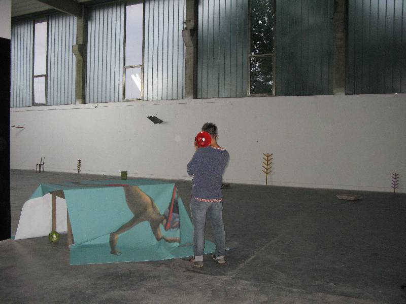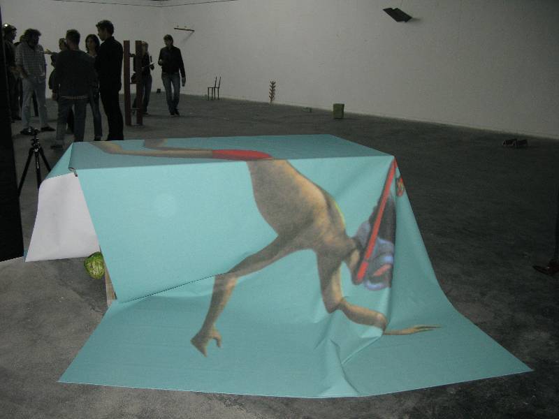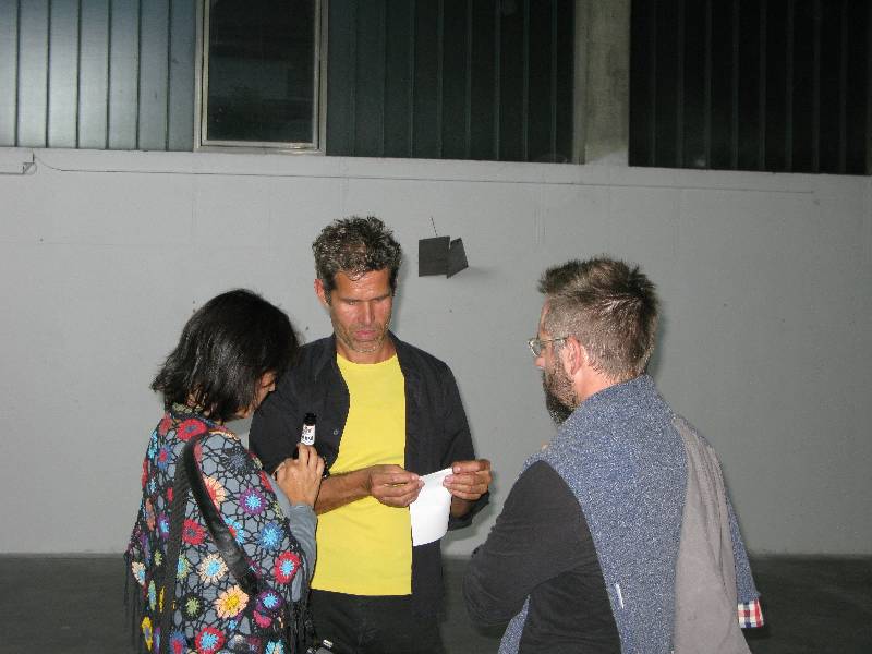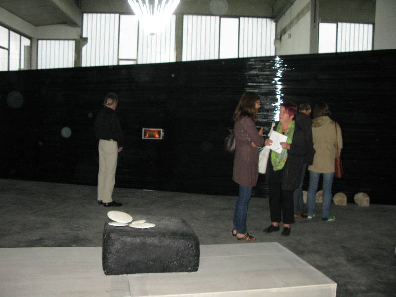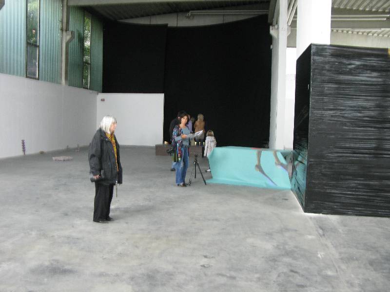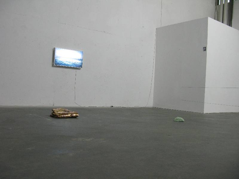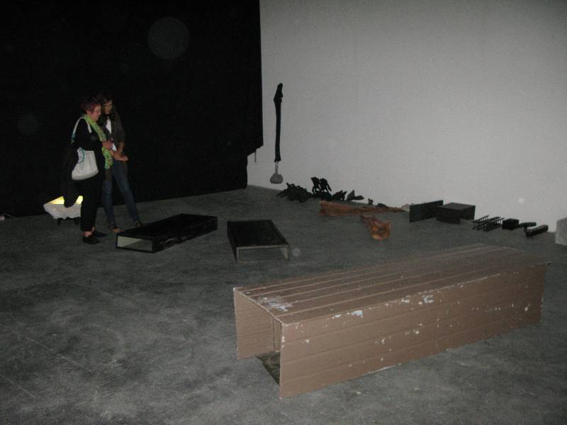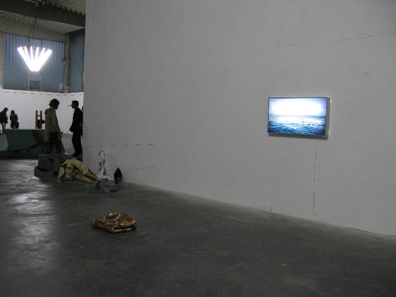 Für Wolfgang Kaiser, in gelbem (goldenen) Shirt unter schwarzem Hemd, sprechen seine Exponate – und ihre Installation. Die mit den Kaiserschen Kunstfiguren bevölkerte Kulturhalle ist zum faszinierenden Schauplatz absurder Ereignisse geworden, den der Besucher durchwandeln darf. Ein Paar Schuhe, schwarz eingefärbt und in den Raum gestellt, verlocken den Besucher zum Berühren; ebenso zieht ein zerknittertes Etwas, zwar golden glänzend, dennoch das Auge irgendwie an den verbeulten Kotflügel eines alten VW-Käfers erinnernd, die Fingerspitzen des Betrachters an, magisch eben, als würde die Optik die Haptik zu Hilfe rufen – zwei winzige rotbraune Sonnenschirme auf einem aus der weißen Wand wachsenden Mini-Balken sind leider für die tastende Hand zu weit entfernt …