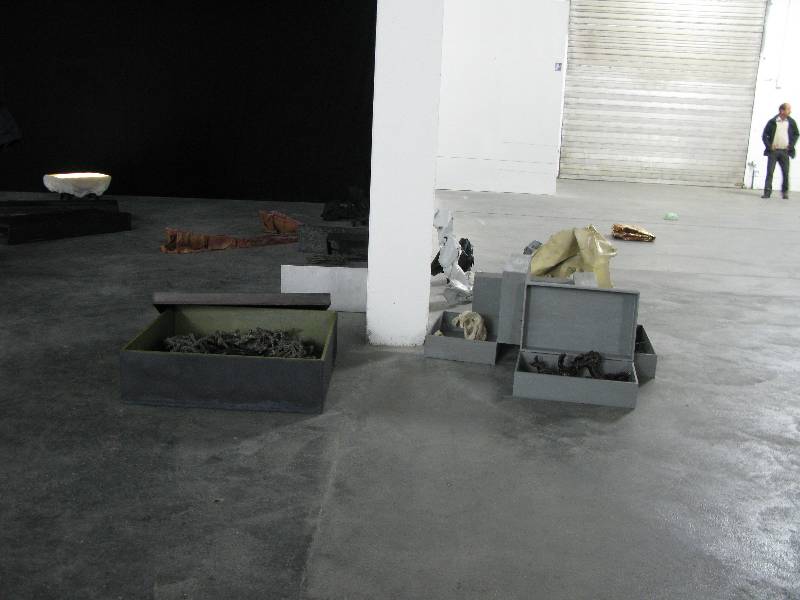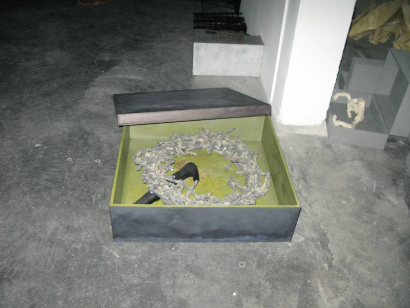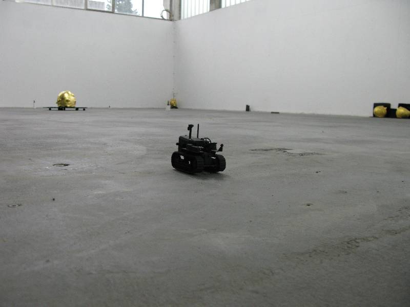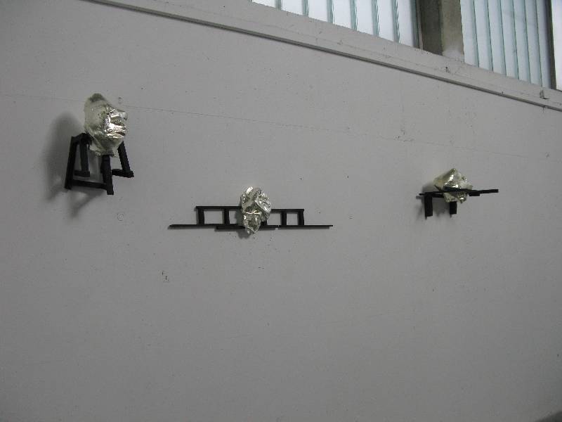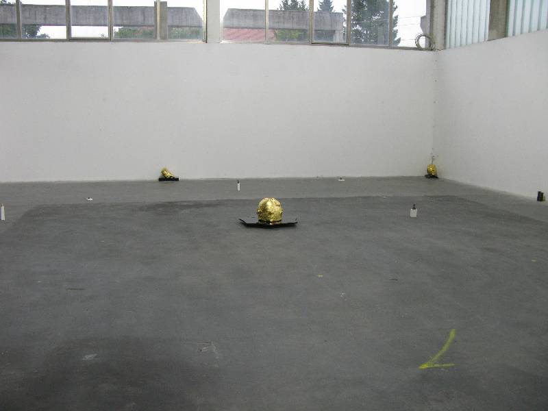 Es ist nicht alles Gold, was in der Kulturhalle glänzt: Golden zwar glitzern Köpfe von den Wänden, ein Raum, den eine schwarze Raupe (nicht das Tier, sondern ein Baugerät in Schwarz und en miniature) bewacht, beheimatet goldene Objekte, die an Schädel gemahnen, doch dem Besucher der Vernissage öffnete sich die Halle bereits beim Eintreten, auf den ersten langen Blick, als geschickte Komposition glänzend platzierter Skulpturen.