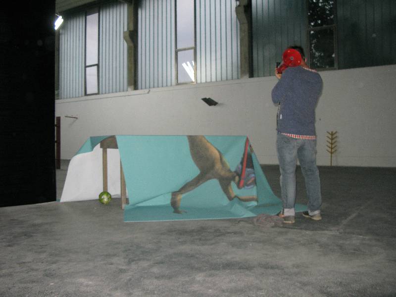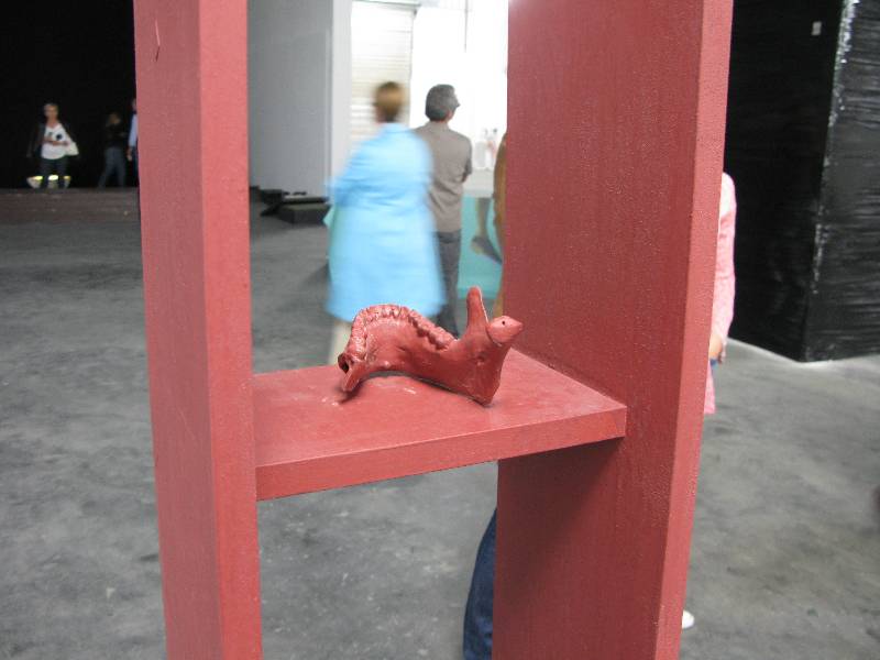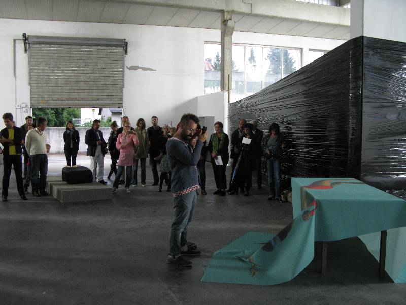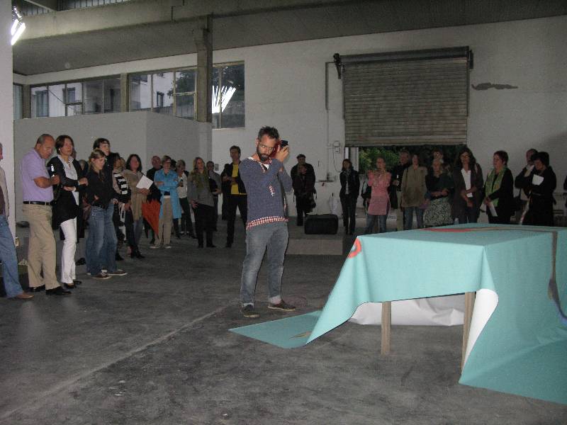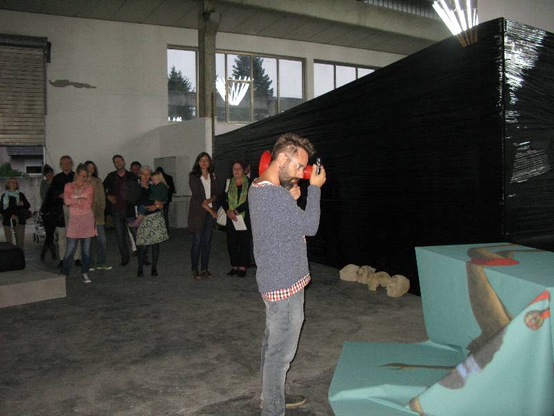 Benedikt Hipp übernahm es, den Künstler vorzustellen: Eigenwillig, mit dem Rücken zum Publikum, trug er ein rotes Megaphon auf der Schulter und speiste dies, mit ihm zur Skulptur verschmolzen, mit seiner Stimme aus dem Handy, die einen von Wolfgang Kaiser inspirierten Text rezitierte: von wahnhaften Träumen auf den Inseln St. Helena, Sizilien und Elba, von schaukelnden Schiffen, von Barken mit geheimnisvoller Fracht, von der Madonna aus Lourdes und ihrer schwarzen bajuwarischen Schwester.
