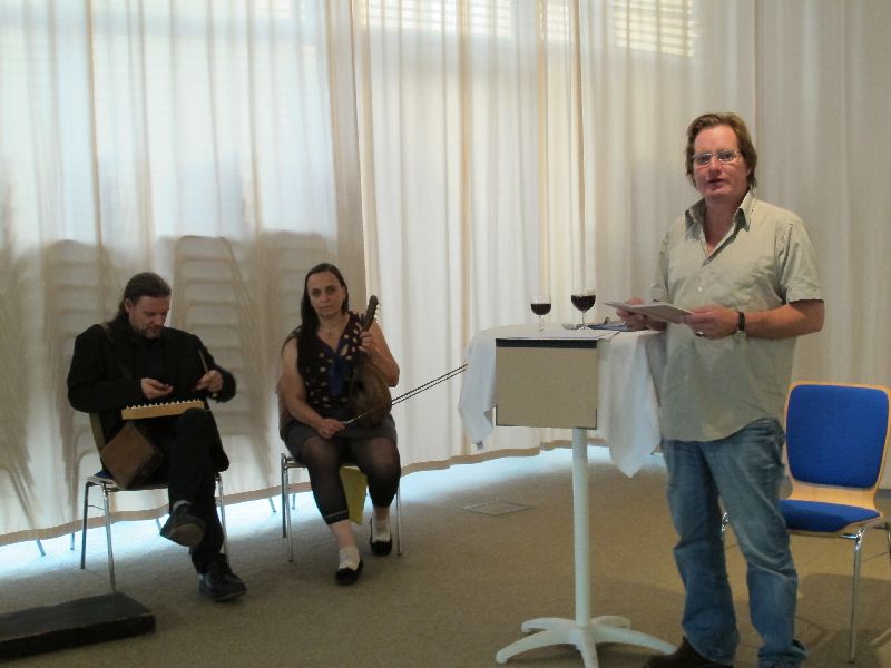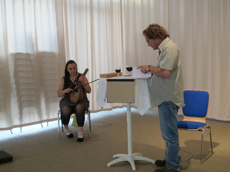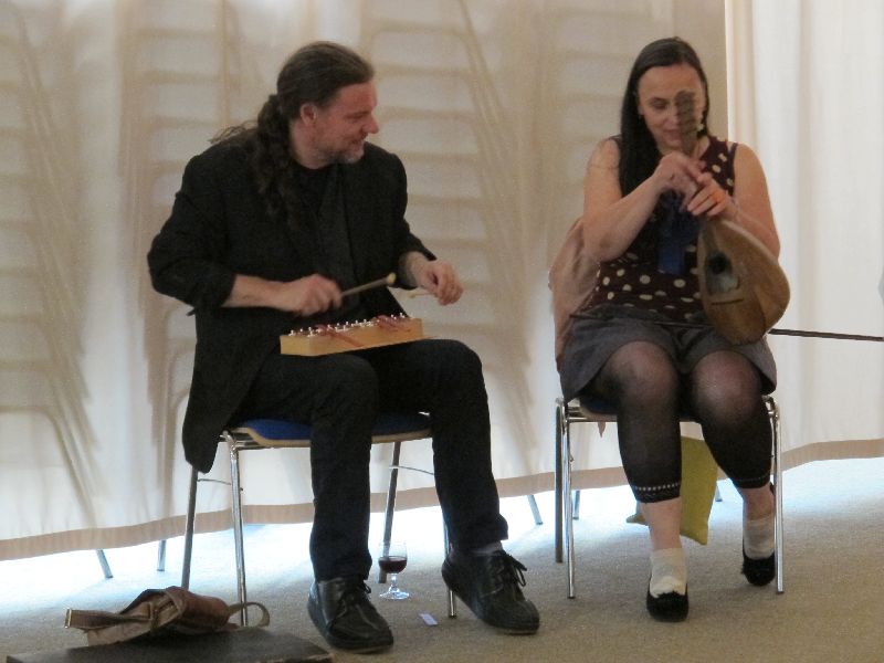 Sven Kalb hat vor seinen Jahren an der Akademie der Bildenden Künste in München Germanistik studiert. Als Reflex darauf entstanden eigene Gedichte – ein Bändchen erschien im verlagshaus kastner –, die Sven Kalb immer zweifach vorliest. In den Pausen dazwischen wird musiziert. Am Donnerstag suchten Elisabeth Meisenberger und Rolf-Maria Krückels auf historischen Instrumenten und experimentellen Klanggebern nach akustischen Überraschungen.