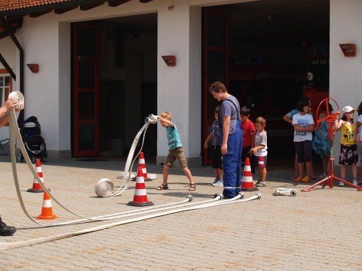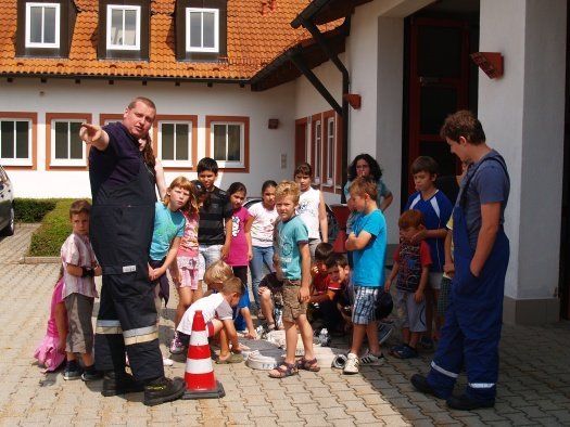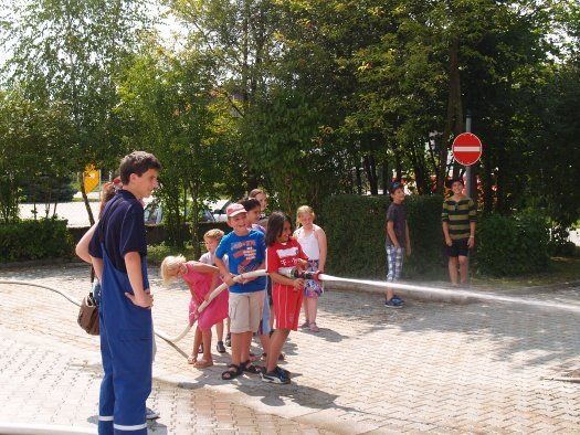 Zwei Jugendwarte und ihre Helfer nahmen die Kinder für gut zwei Stunden in ihre Obhut und machten mit ihnen als erstes einen Rundgang durch das Feuerwehrhaus. Alle wurde angeschaut, von der Einsatzzentrale bis zum Schlauchturm wo die gewaschenen Schläuche wieder zum trocknen aufgehängt werden. Die Kinder waren sehr interessiert und hatten auch einige Fragen an die Jugendwarte. Nach der Besichtigung des Feuerwehrhauses kam dann der schönste Teil des Feriennachmittages. Die Kids durften sich im Schlauch ausrollen, Sandsäcke werfen üben und natürlich auch einmal mit einem Feuerwehrschlauch spritzen. Alle hatten riesigen Spaß dabei.