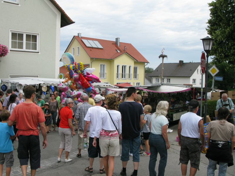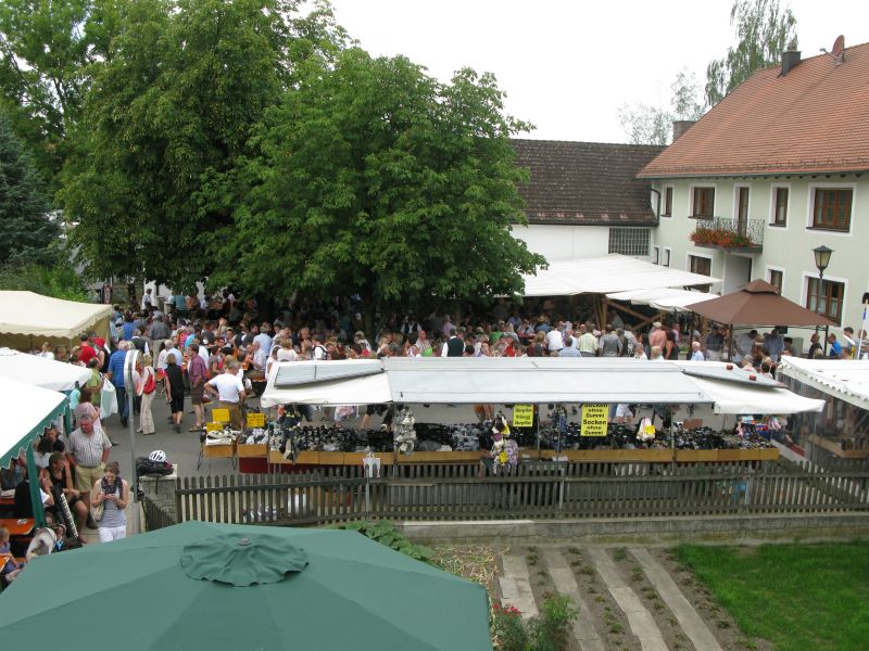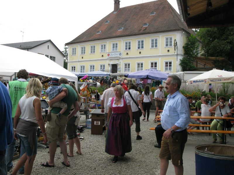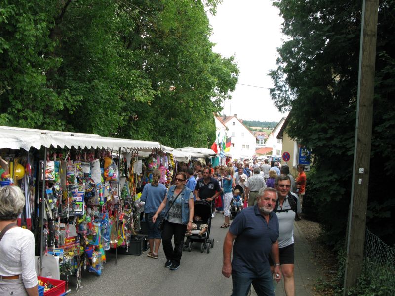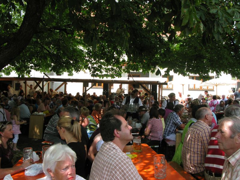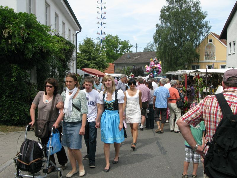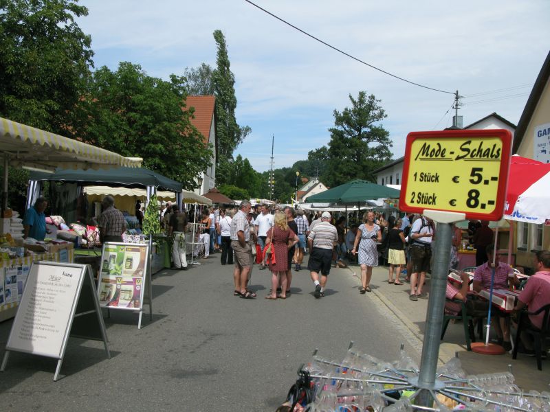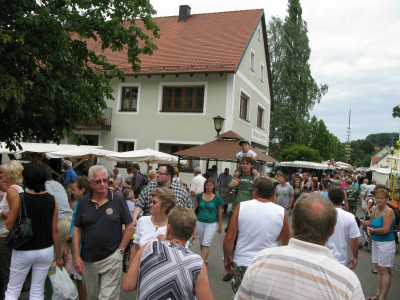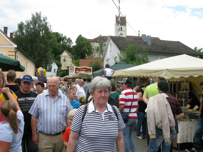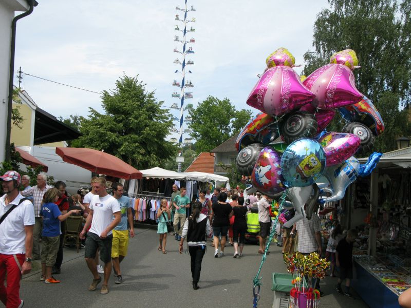 Am Fuße des Schlossbergs aber: Wunderbares Wetter, über 200 Fieranten, ein unfassbares Angebot an außergewöhnlichen Waren und kulinarischen Genüssen – und die Gäste hatten ihr Vergnügen in der Budenstraße. Beim Metzger Buchberger spielte eine Band zur Untermalung der kulinarischen Genüsse auf – „a Mass und a Schweinswürstl genga no imma!“ –, bei Gianni gegenüber dominierten italienische Schmankerl, der Biergarten beim Postwirt war besetzt bis auf den letzten Platz, und die Kinder freuten sich über den Schwung auf der Schiffschaukel und eine neue Runde auf dem Karussell. Unglaubliche Raritäten bot der Flohmarkt des TSV für geduldige Entdecker, in der Weinlaube des Tennisclubs saßen nicht nur die, die einen edlen Tropfen, sondern auch ein Weißbier nebst Kaffee und Kuchen zu schätzen wissen, und abends zog es die Jungen und Junggebliebenen in die Disco unter dem Maibaum.
