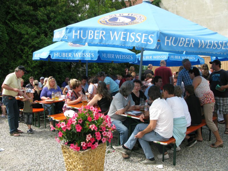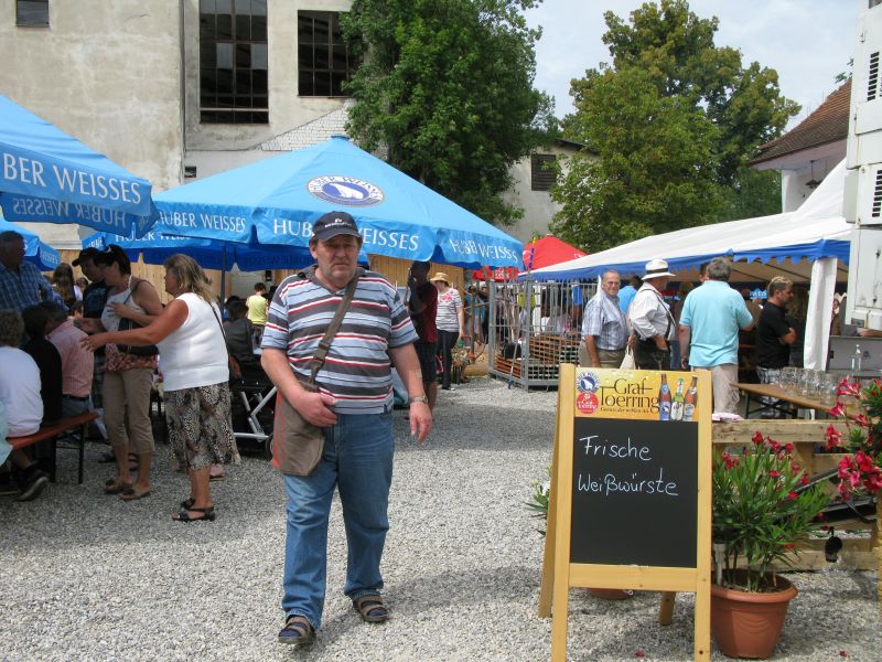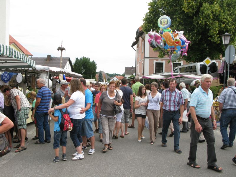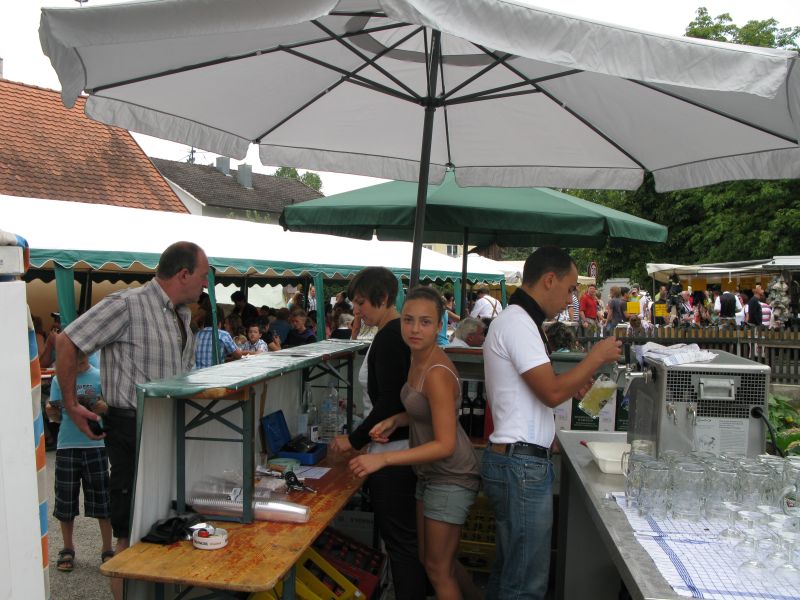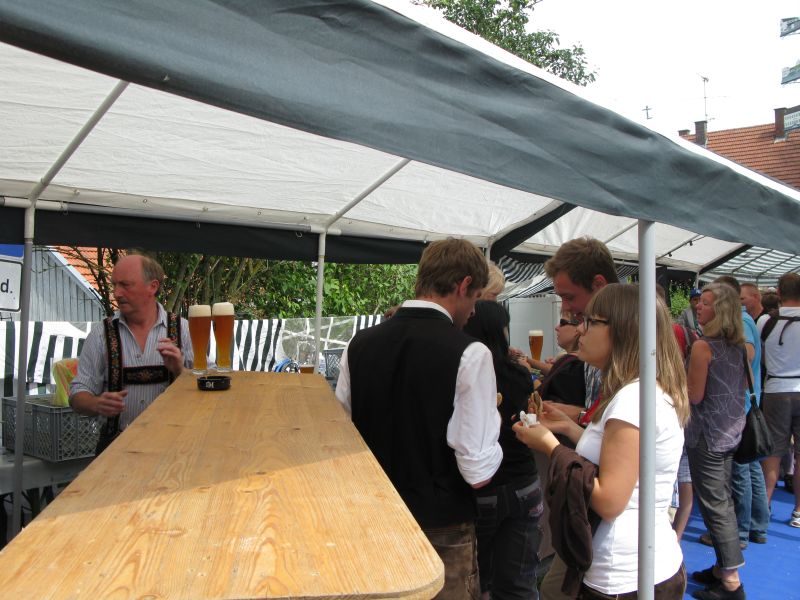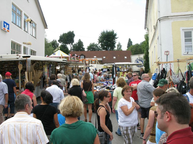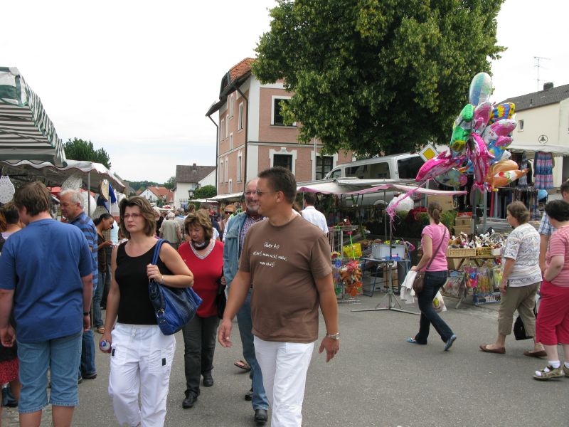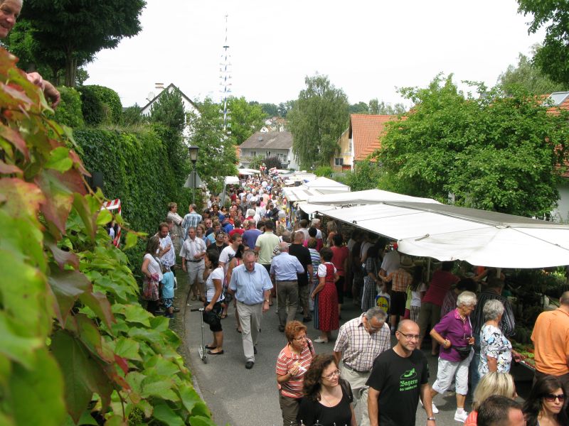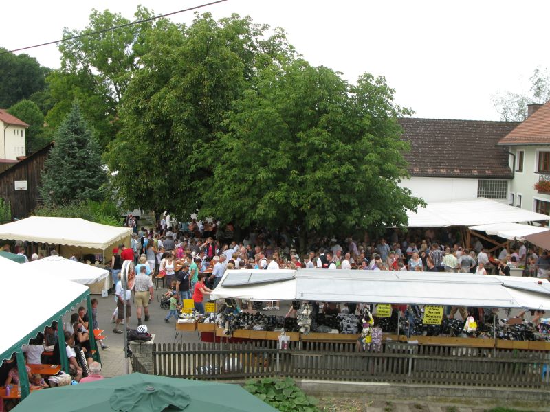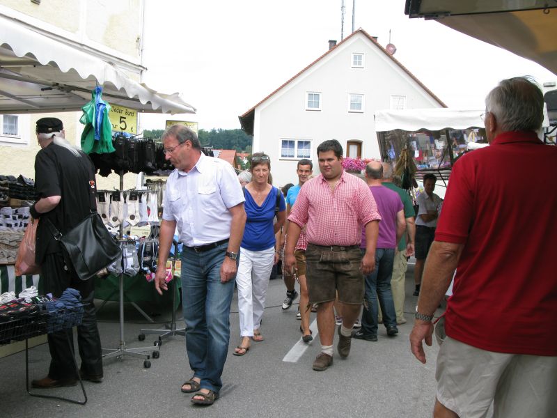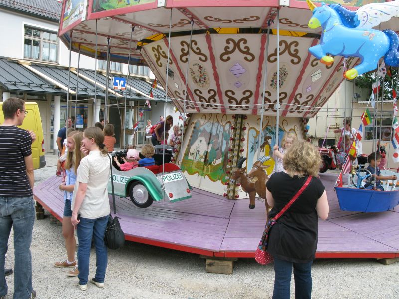 Am Fuße des Schlossbergs aber: Wunderbares Wetter, über 200 Fieranten, ein unfassbares Angebot an außergewöhnlichen Waren und kulinarischen Genüssen – und die Gäste hatten ihr Vergnügen in der Budenstraße. Beim Metzger Buchberger spielte eine Band zur Untermalung der kulinarischen Genüsse auf – „a Mass und a Schweinswürstl genga no imma!“ –, bei Gianni gegenüber dominierten italienische Schmankerl, der Biergarten beim Postwirt war besetzt bis auf den letzten Platz, und die Kinder freuten sich über den Schwung auf der Schiffschaukel und eine neue Runde auf dem Karussell. Unglaubliche Raritäten bot der Flohmarkt des TSV für geduldige Entdecker, in der Weinlaube des Tennisclubs saßen nicht nur die, die einen edlen Tropfen, sondern auch ein Weißbier nebst Kaffee und Kuchen zu schätzen wissen, und abends zog es die Jungen und Junggebliebenen in die Disco unter dem Maibaum.